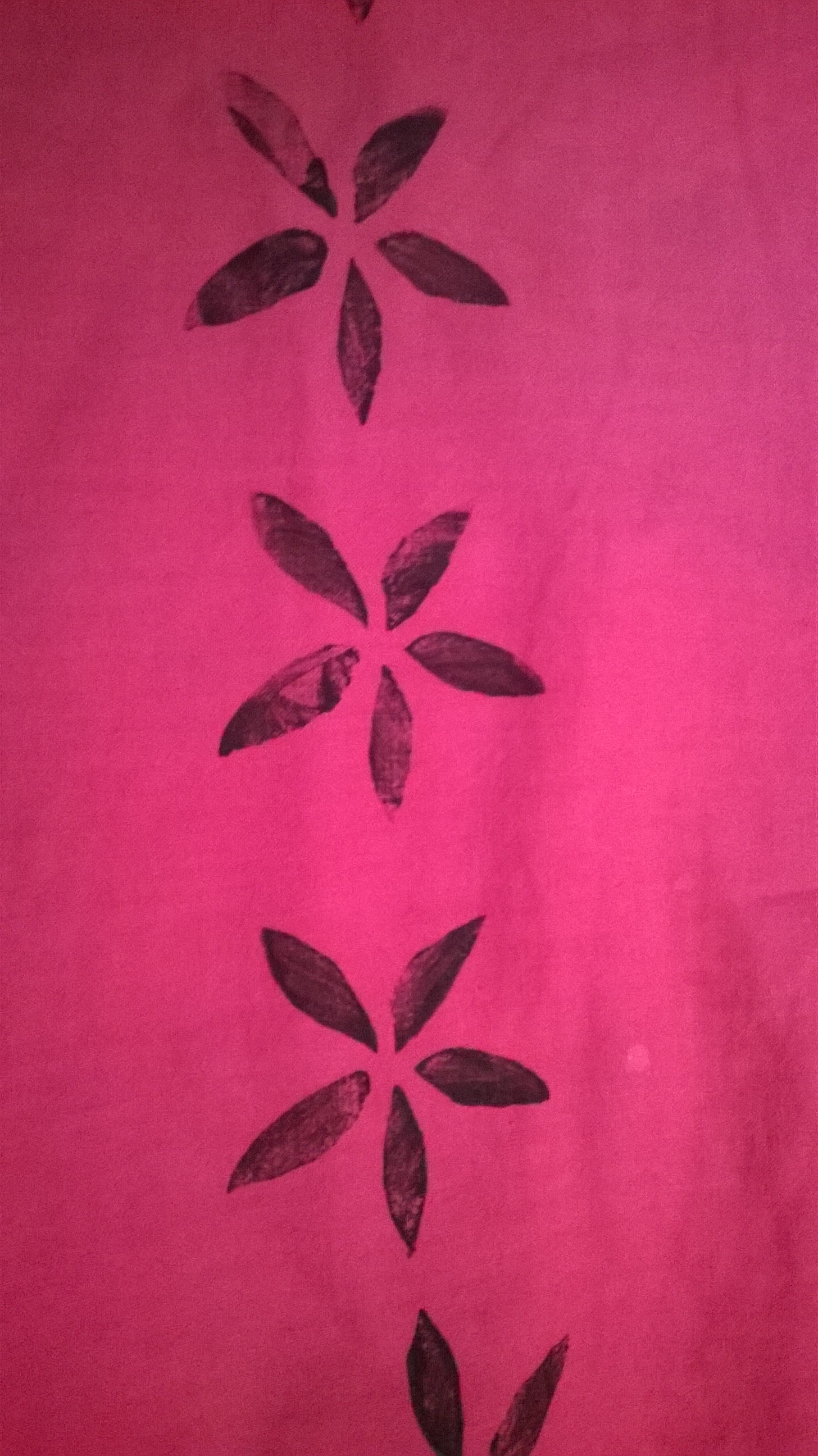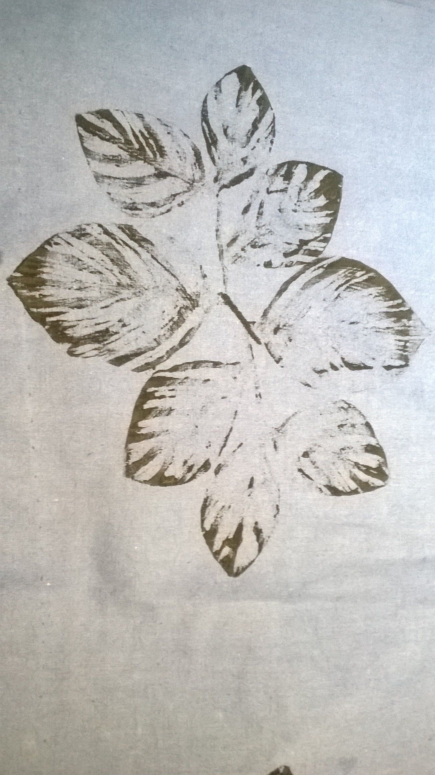 Next I made a lino cut (based on a rubbing of leaves found on one of the French campsites) by drawing directly onto the lino with pencil. The lino was cut out with two different lino cutters, one narrow and one broad and then scissors were used to cut round the leaf shapes The lino cut was attached to a block of wood with double-sided tape. The print was made with Speedball fabric paint (found in a skip!). The block was printed twice to make the design. Once dry, it had to be ironed for 3-5 minutes to ‘cure’ it.