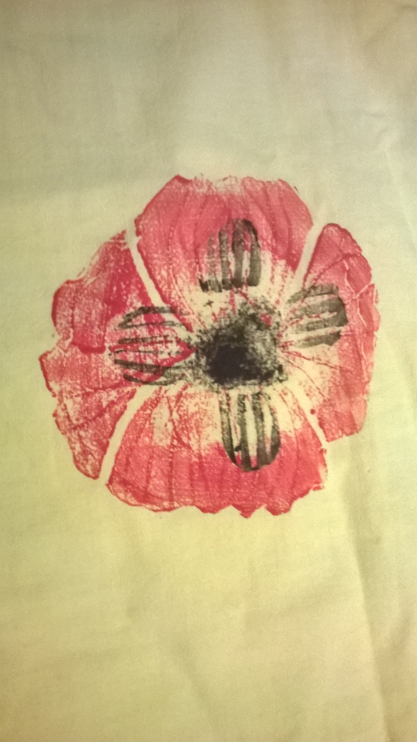 Two new lino-cuts were created for the yellow dress. This time, the lino was cut out with scissors, before using a lino-cutter to create lines. The resulting poppy design was printed onto the dress pieces, red first and then black.