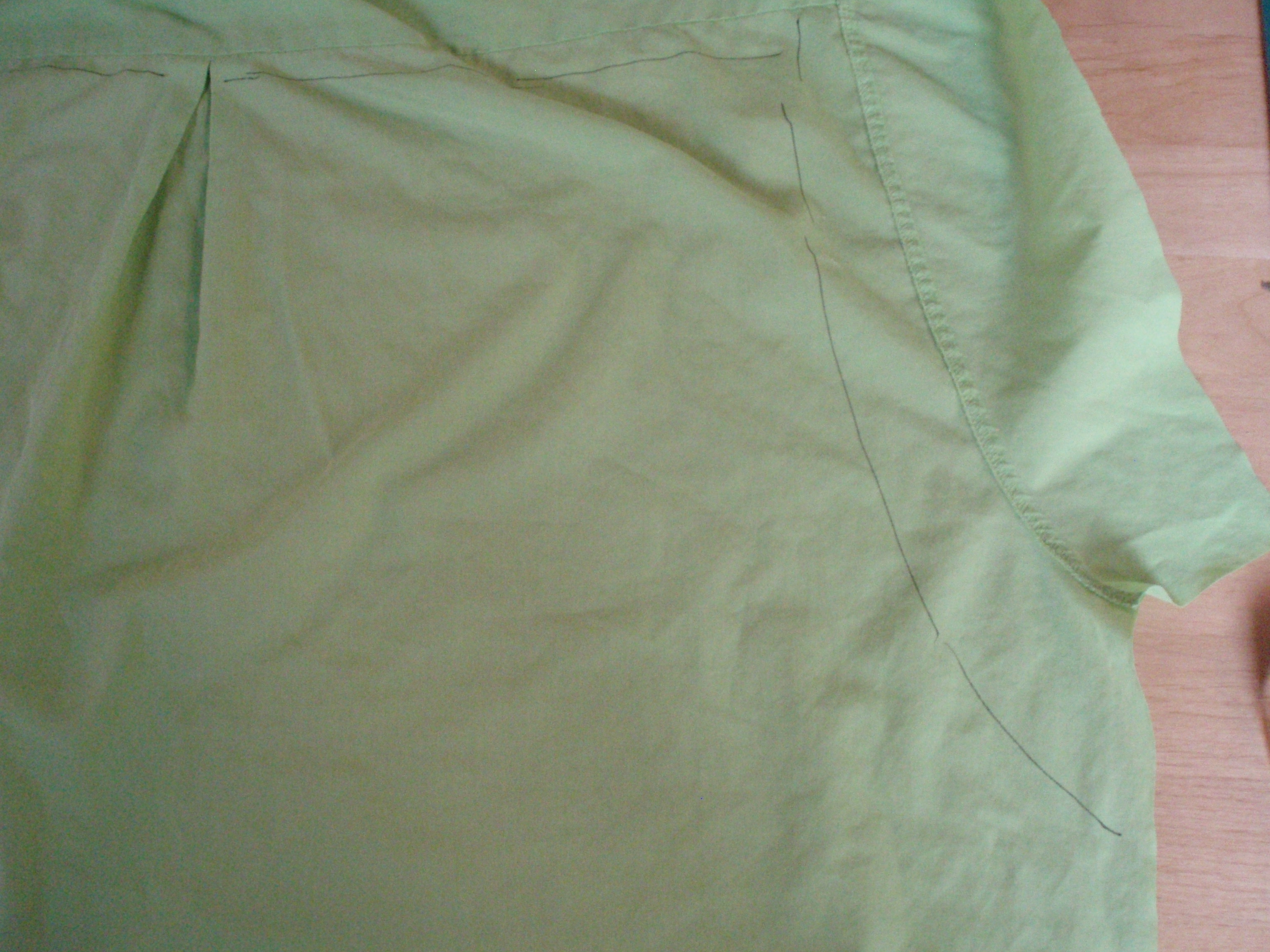 14. Now cut from 3 inches (7.5cm) below the underarm seam, up to the yoke, across the yoke and down the other side to end up 3 inches below the underarm seam on the opposite side.