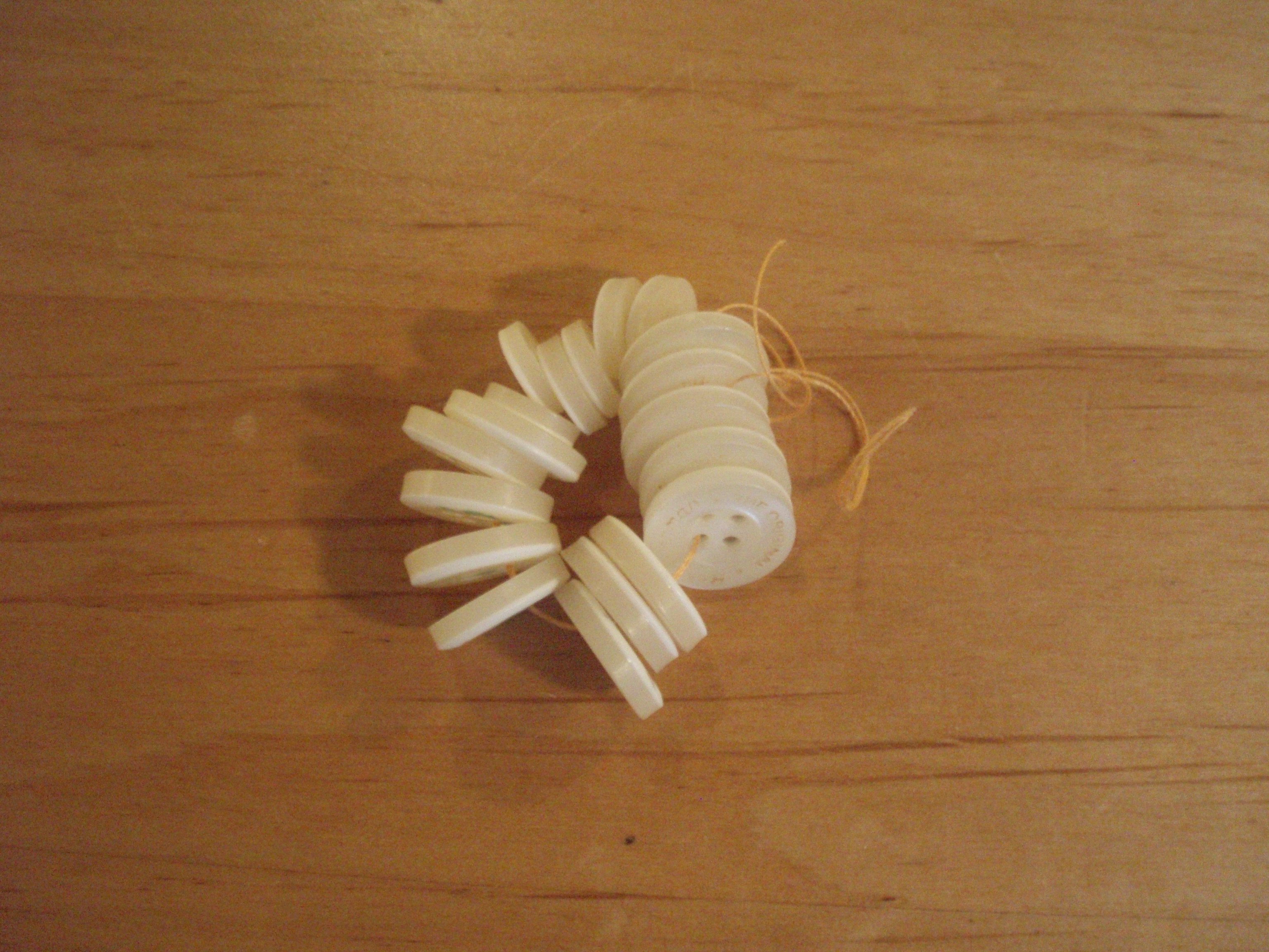 8. Using a double thread, string the buttons onto the thread, by putting the needle through a single hole in each button and then tying a double knot to secure. I use buttons for quilting (see ‘Pretty Pouches’ and ‘Blue Mountains’ quilt.)
