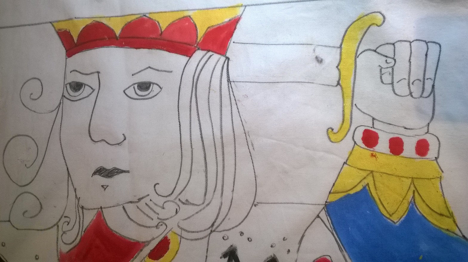 I then started with the King’s face and sword arm and worked down to the waist. I used a large piece of tracing paper to trace the face I had drawn, turned the fabric upside down and traced it off. I did the same with the sword and then filled the other decorative details in by eye. I used pencil for the first drawing, then quickly went over the line with a waterproof black pen.