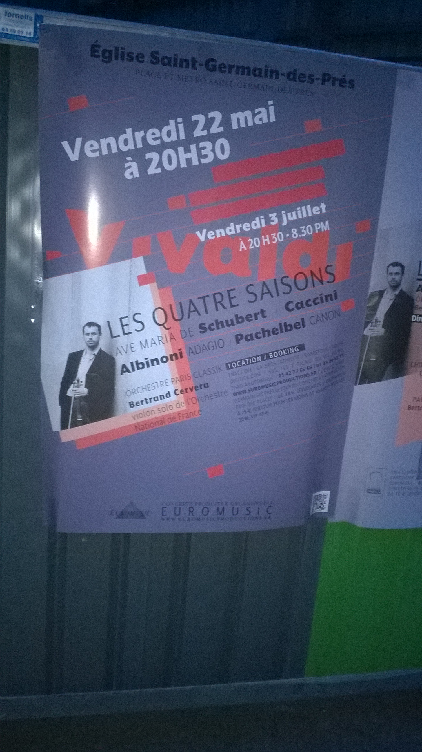 Another highlight was an evening concert in the oldest church in Paris, St Germain des Pres (www.eglise-sgp.org). The performers – a sextet – nearly lifted the roof of with their hugely energetic and vigorous interpretation of Pachelbel’s Canon, Adagio by Albinoni, Ave Maria by Schubert and Vivaldi’s Four Seasons. The music was led by the very dynamic Bertrand Cervera (pictured in the poster for the concert, seen below) who plays solo violin for the national orchestra (Orchestre National de France).