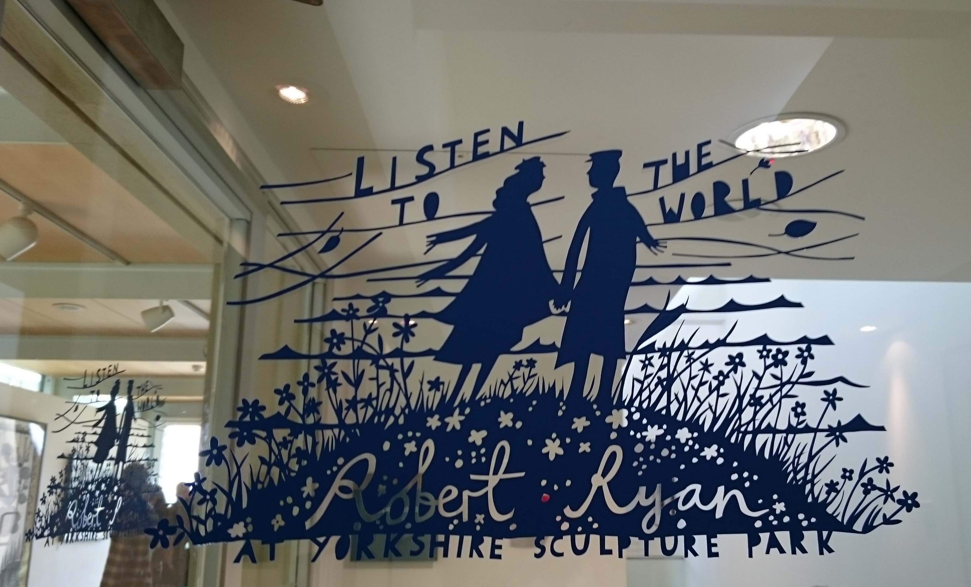 Today there was really just time for a sandwich lunch on the cafe terrace, looking out across the park (complete with sheep grazing) and then a visit to the current exhibition of paper-cuts by Rob Ryan entitled ‘Listen to the world’. I’ve enjoyed this artist’s work, by dint of being a recipient of some really delightful cards designed by him (for example on Valentine’s Day). The words included in the paper-cuts are as telling as the images and they often suggest loving, romantic and imaginative ideas. I really enjoy seeing the inclusion of words in art (craft?) and it’s something I enjoy doing too, by adding letters and words to embroideries and quilts that I make.