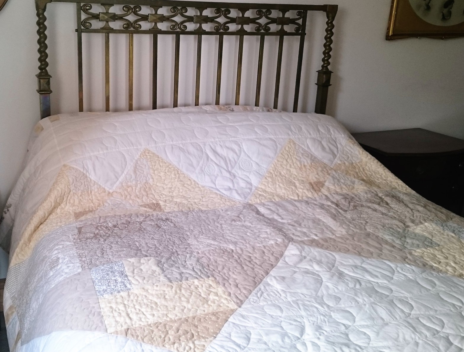 This quilt is entitled ‘Two Hearts’ inspired perhaps by the phrase ‘Two hearts are better than one’ made famous by the song by Bruce Springsteen. At the Festival of Quilts it was entered in the ‘Contemporary’ category. It’s a large double quilt designed for a modern interior. I plan to write a pattern for this in the next few weeks. The two central hearts and the border are done in creams, greys and pale caramels, with white for the remainder.