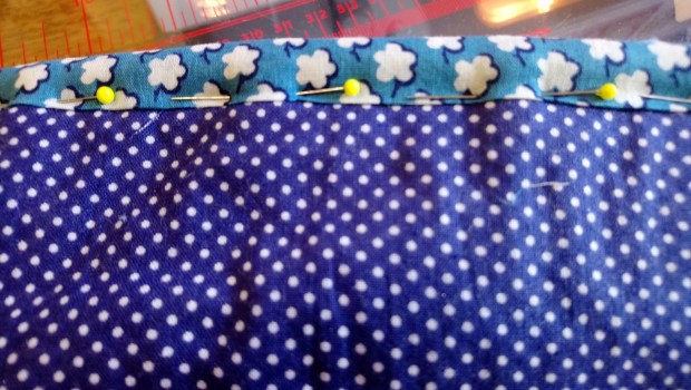 Pin the free ends of the binding right sides together, using your finger-pressed creases as your guide. Stitch on the sewing machine.