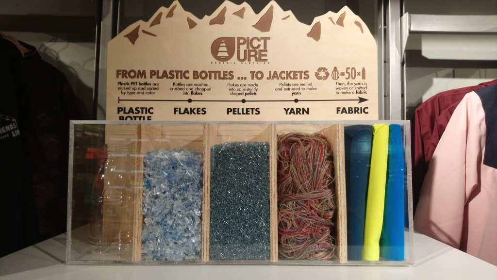 It shows in stages how the ski-wear brand ‘Picture’ uses recycled plastic to make first flakes, then pellets, then yarn, which can be woven into cloth for their jackets. Here is a photo of a ‘Picture’ ski jacket.