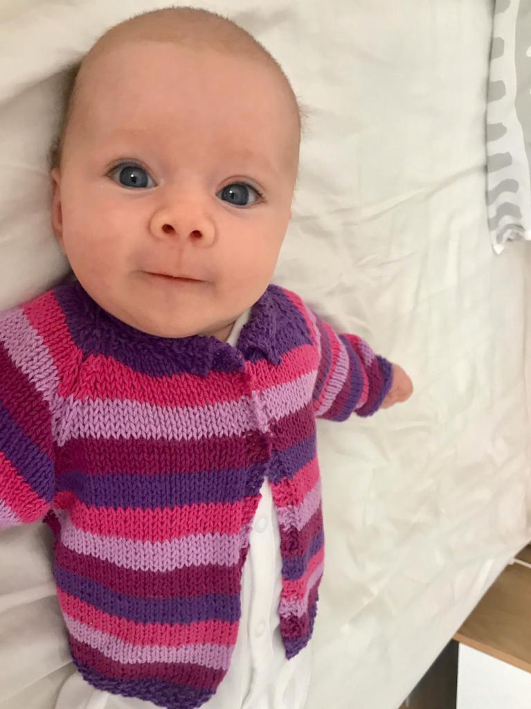 It’s all finished now (stripes matching across the raglan sleeves and all). The small garment arrived safely at its destination via the Royal Mail and is being worn by this very dear baby, who is eight weeks old today!