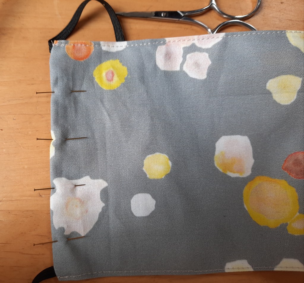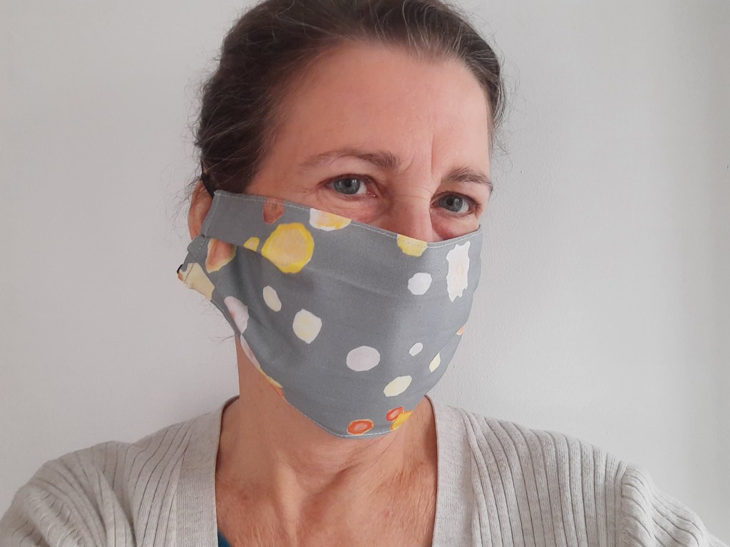 I’ve now made two masks by this method and the mask is comfortable to wear. I can’t tolerate elastic next to my skin, so I like this version – where the elastic goes round the back of my head, rather than behind my ears.