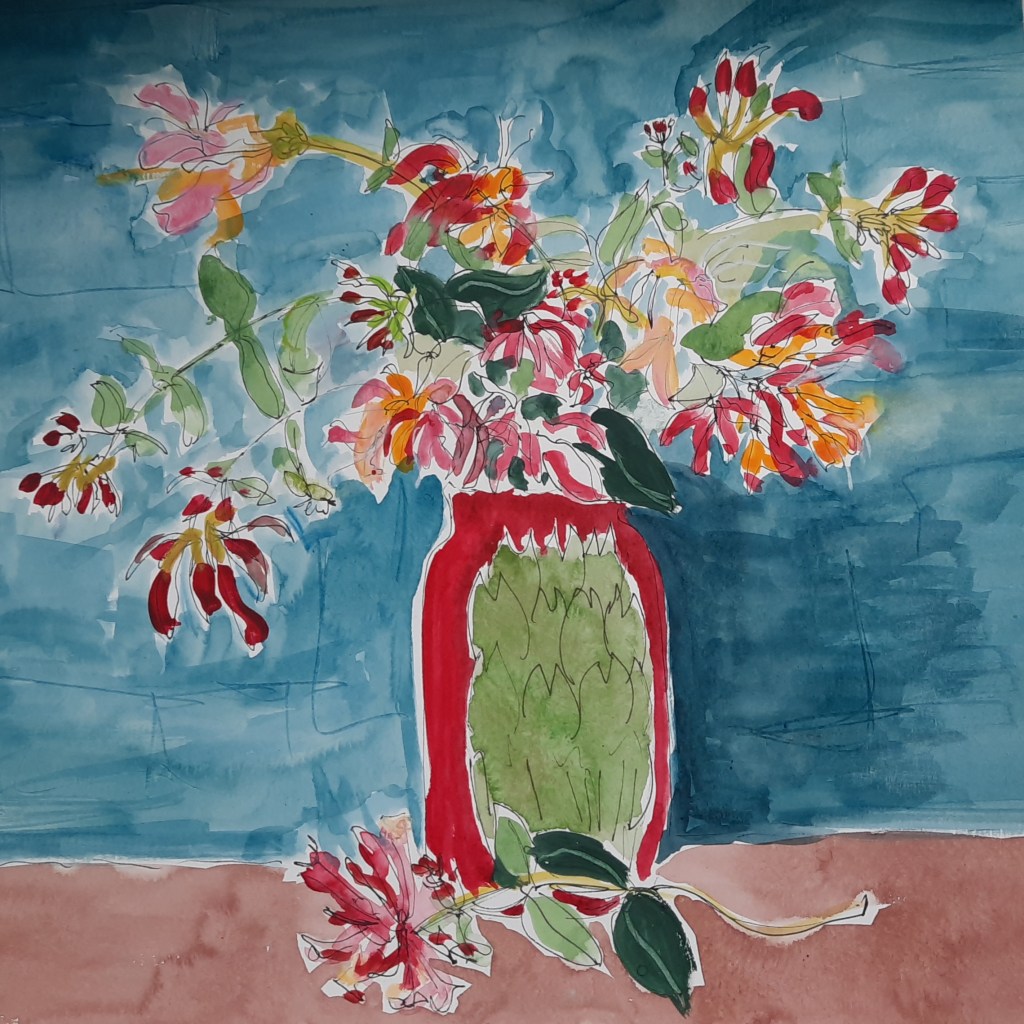 It’s sad to see the paintings go, but I am keeping one. It’s a while since I painted this one and I don’t remember the occasion, but I do love honeysuckle, which grew in the garden when I was a child, and I’m fond of the shade of blue in the background, so this was will be framed and go on the wall!