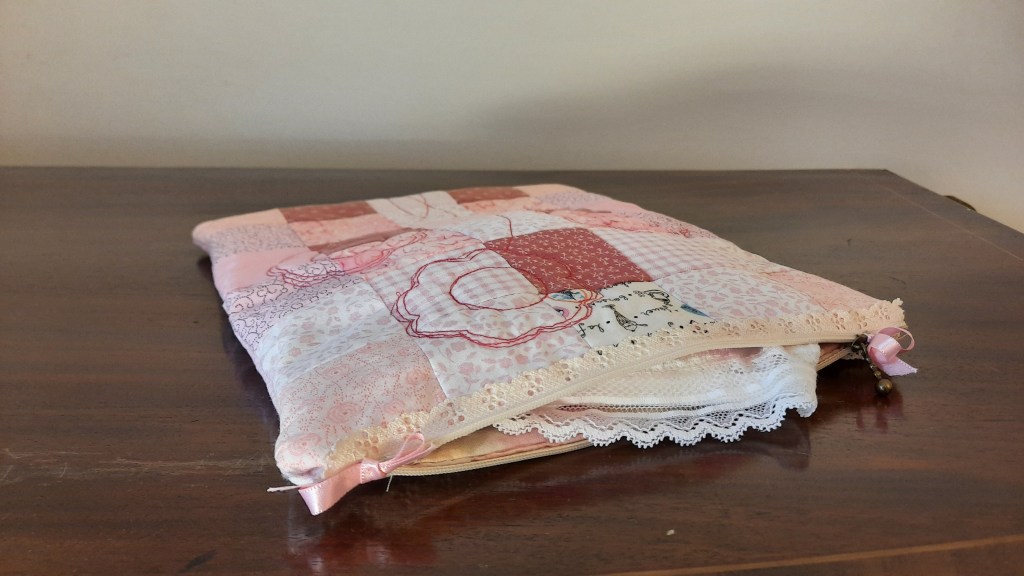 It’s made with pink patchwork pieces, has a design of free-machine quilting on each side and a decorative zip at the top, enhanced with pretty pink bows. The size is 10 x 12″ (25.5 x 30.5cm) and it has a printed fabric lining.