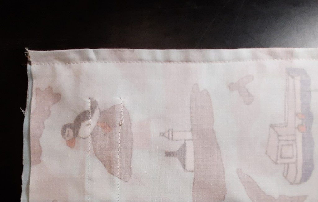 Turn the bag to the right side and press. Press both side seams towards the back of the bag. Turn over the top raw edge ¼” (6mm) and press, then turn another ¼” (6mm) and press again. Stitch along the top as shown.
