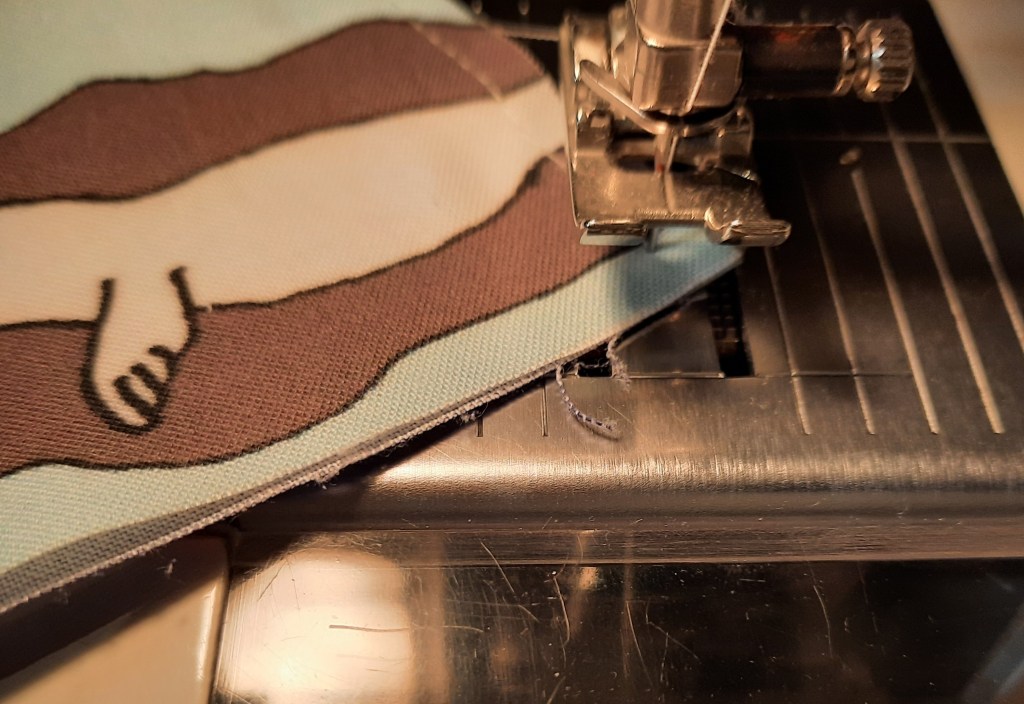 Place the wrong sides of the the front and back together and stitch round three sides with a ¼”(6mm) seam, leaving the top open. Raise the presser foot and pivot on the corners, as shown.