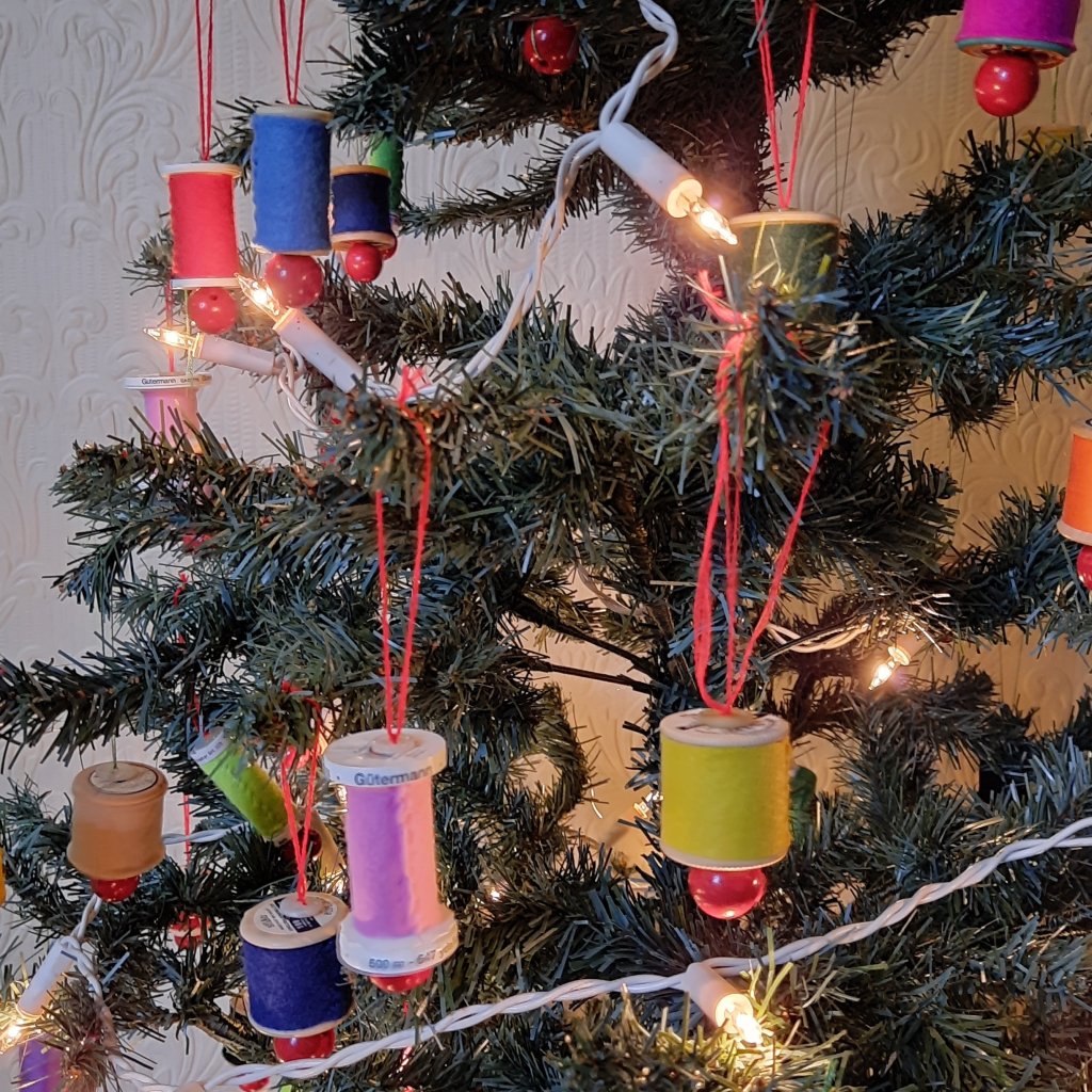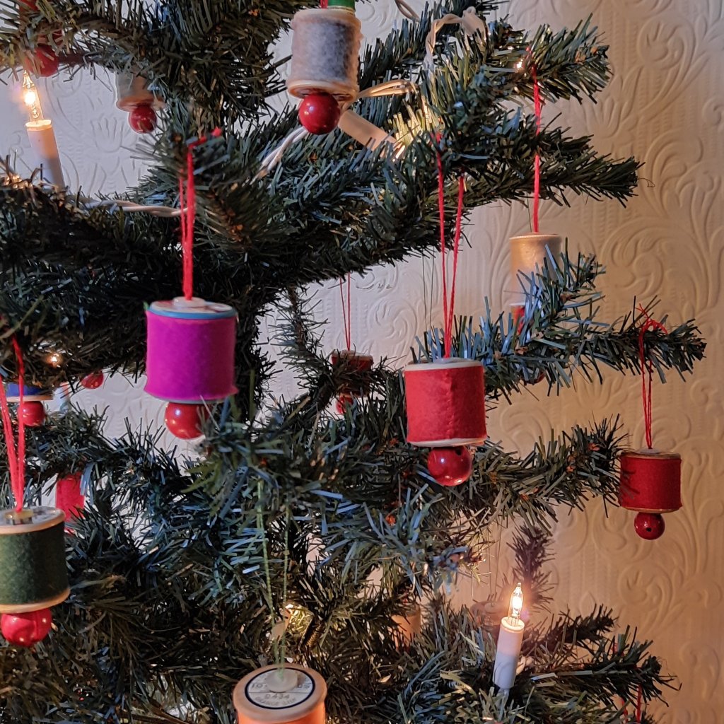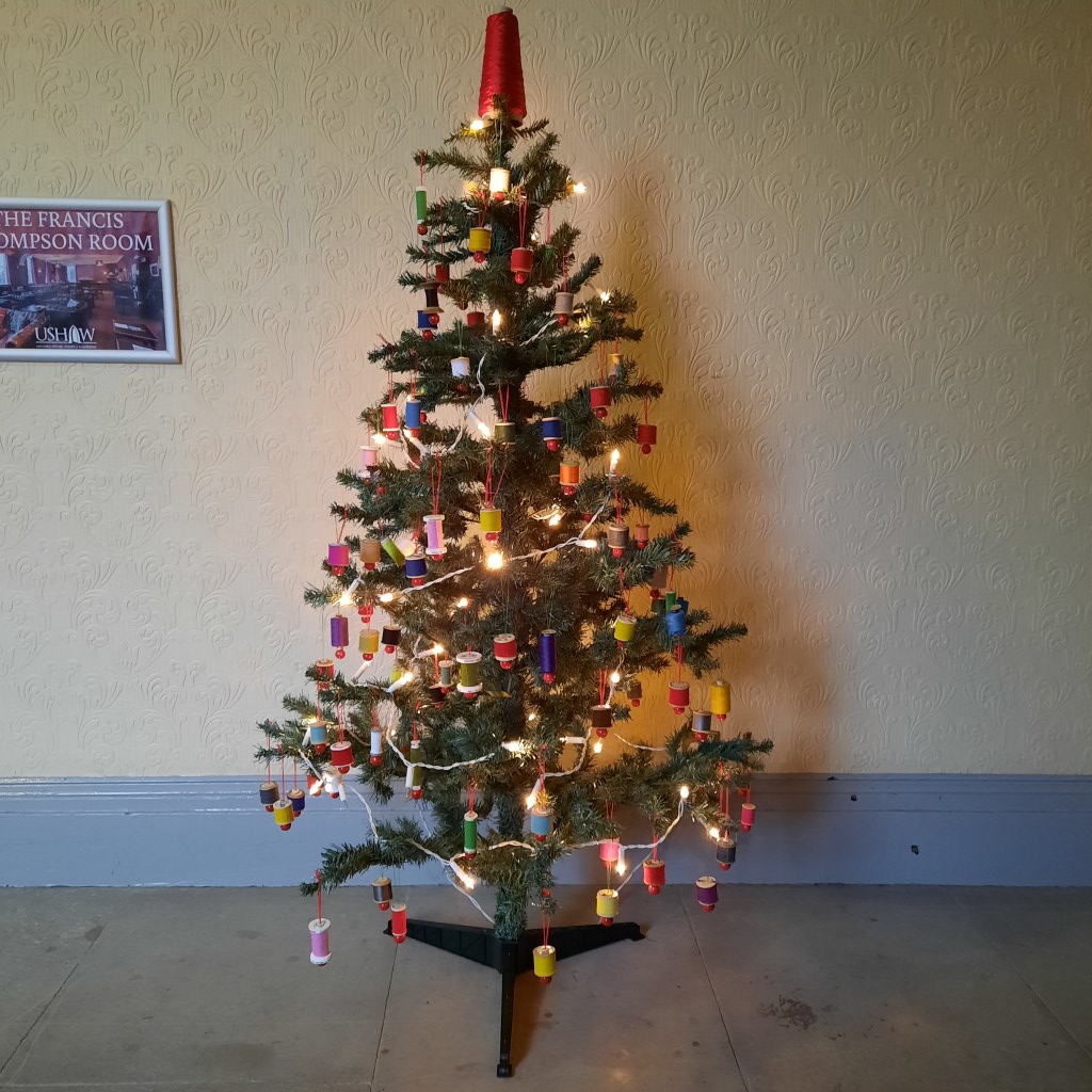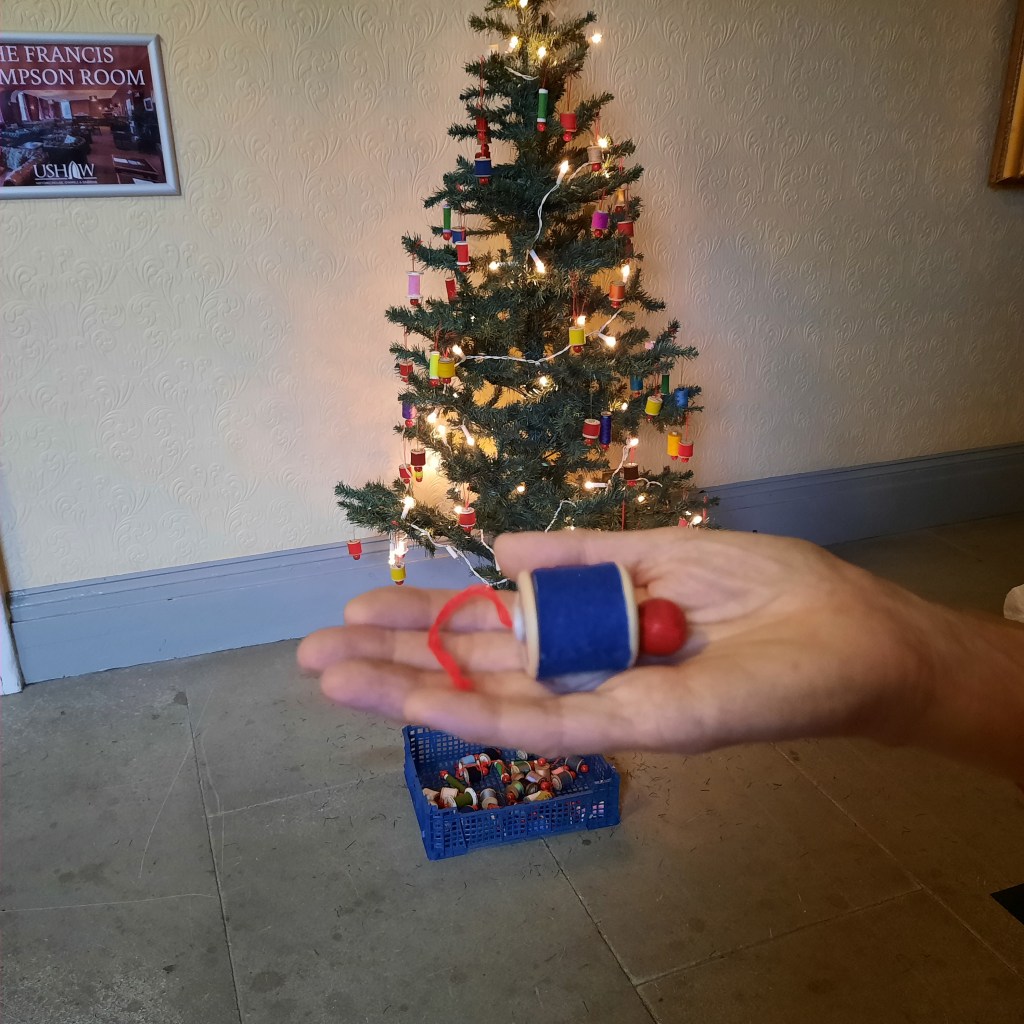 As many of you know, I have a studio at Ushaw, Durham (here). There is a company of artists and makers there and we were all invited to contribute to a second Christmas tree festival this year (see here for last year’s contribution). I made a hundred ornaments from cotton-reels for my tree. Some were vintage reels where the thread was too weak to use but the colour still pretty. Others were empty reels with a strip of coloured felt stitched on, to represent the thread. All of them had a button at the top and a red bead beneath so they would hang nicely. There’s a cone of red thread on the top. Here was the tree being set up.
