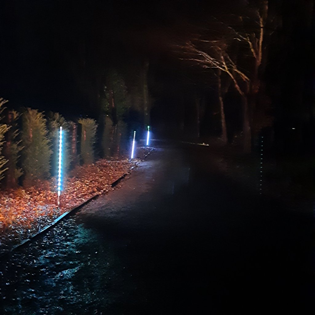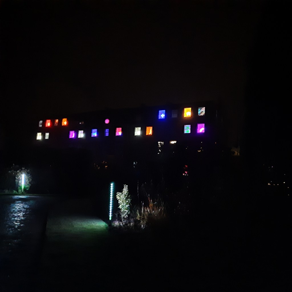 It looks pretty at night, as one of a row of illuminated trees, shining out into the darkness,