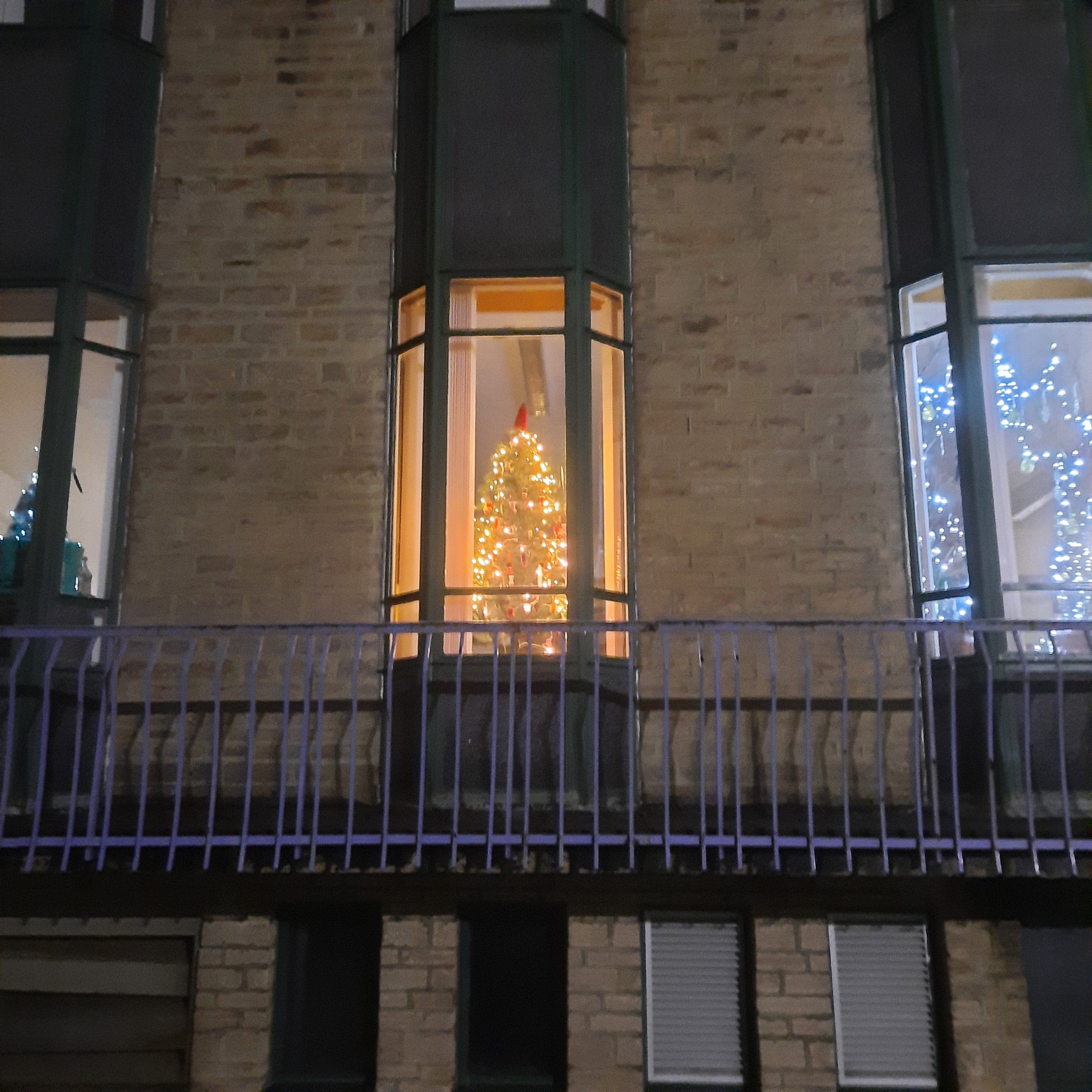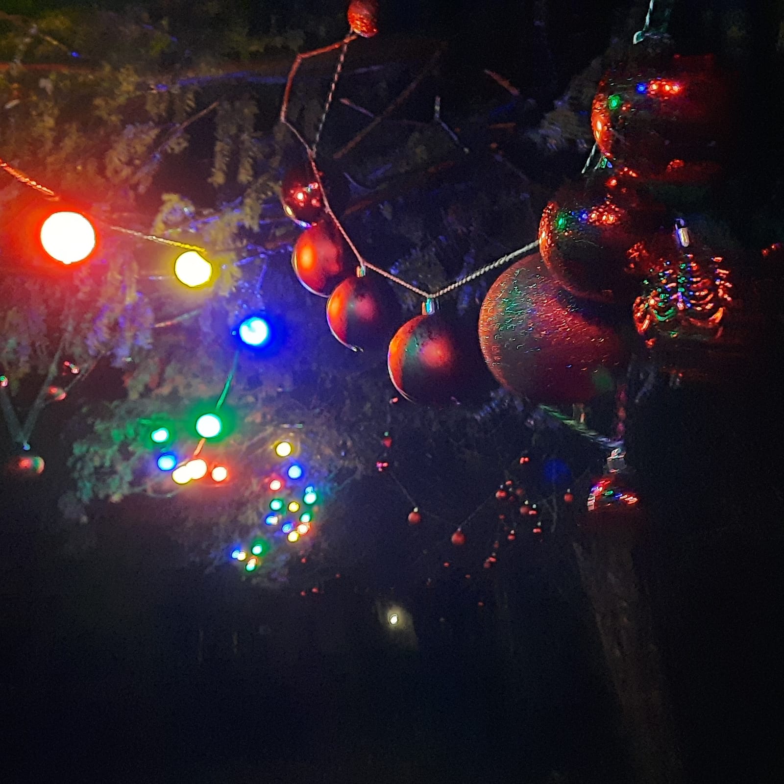 It looks pretty at night, as one of a row of illuminated trees, shining out into the darkness,