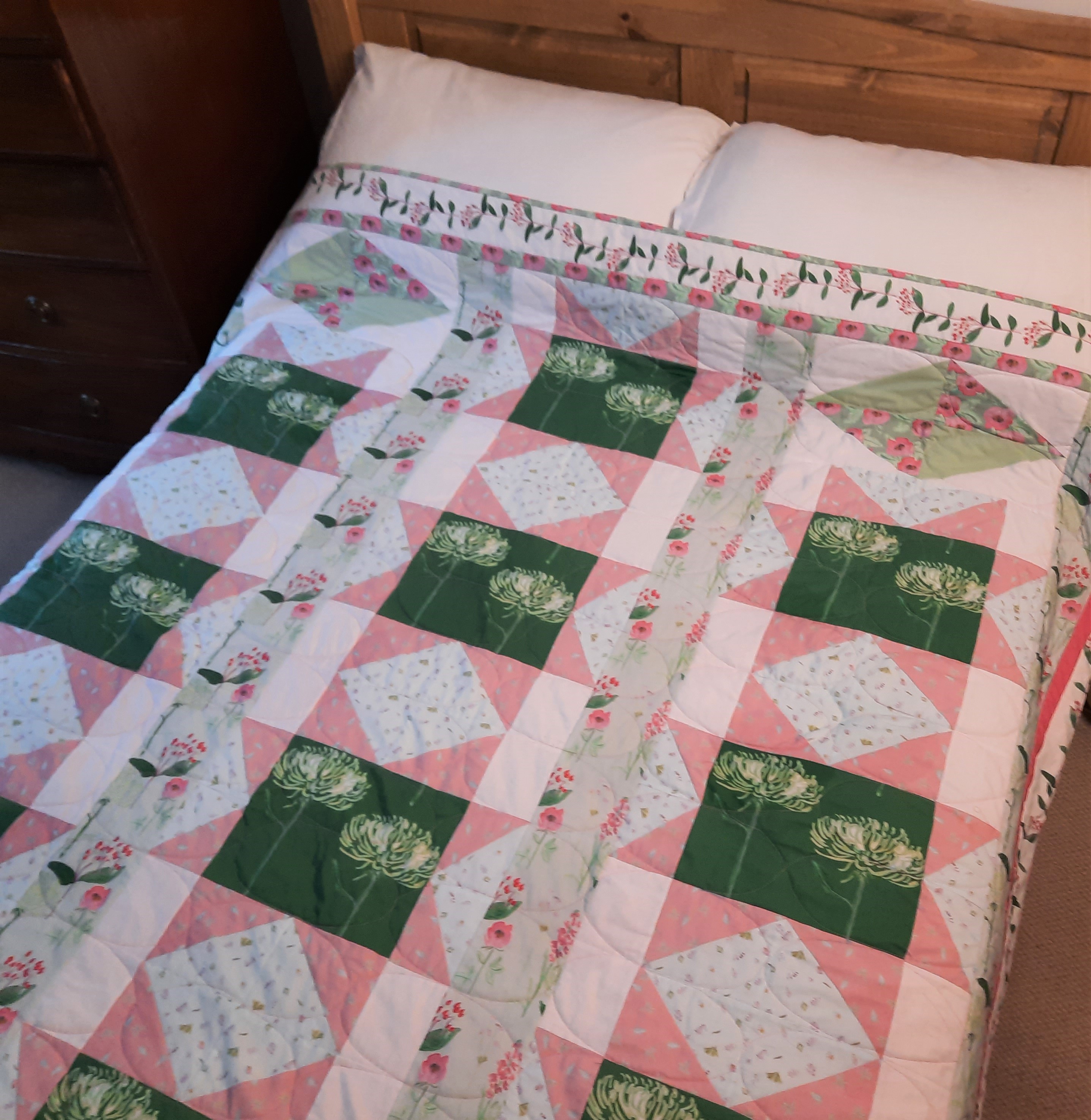 This is a double-bed quilt, measuring 72 x 72″ (183 x 183cm). This is what it looks like indoors, on a bed.