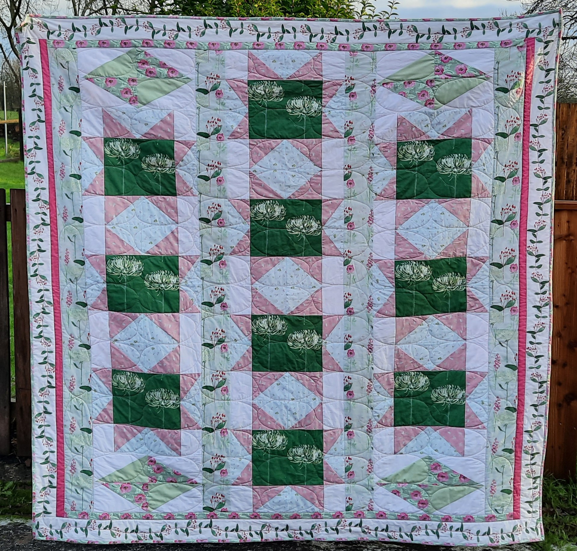 The quilt is called ‘Summer Bouquets’ after the fabric collection of the same name. It’s been designed to work with the six fabrics in the collection (by Amanda Jane Textiles, from Spoonflower) along with three solid colours. The links for each fabric are given in the list below.
