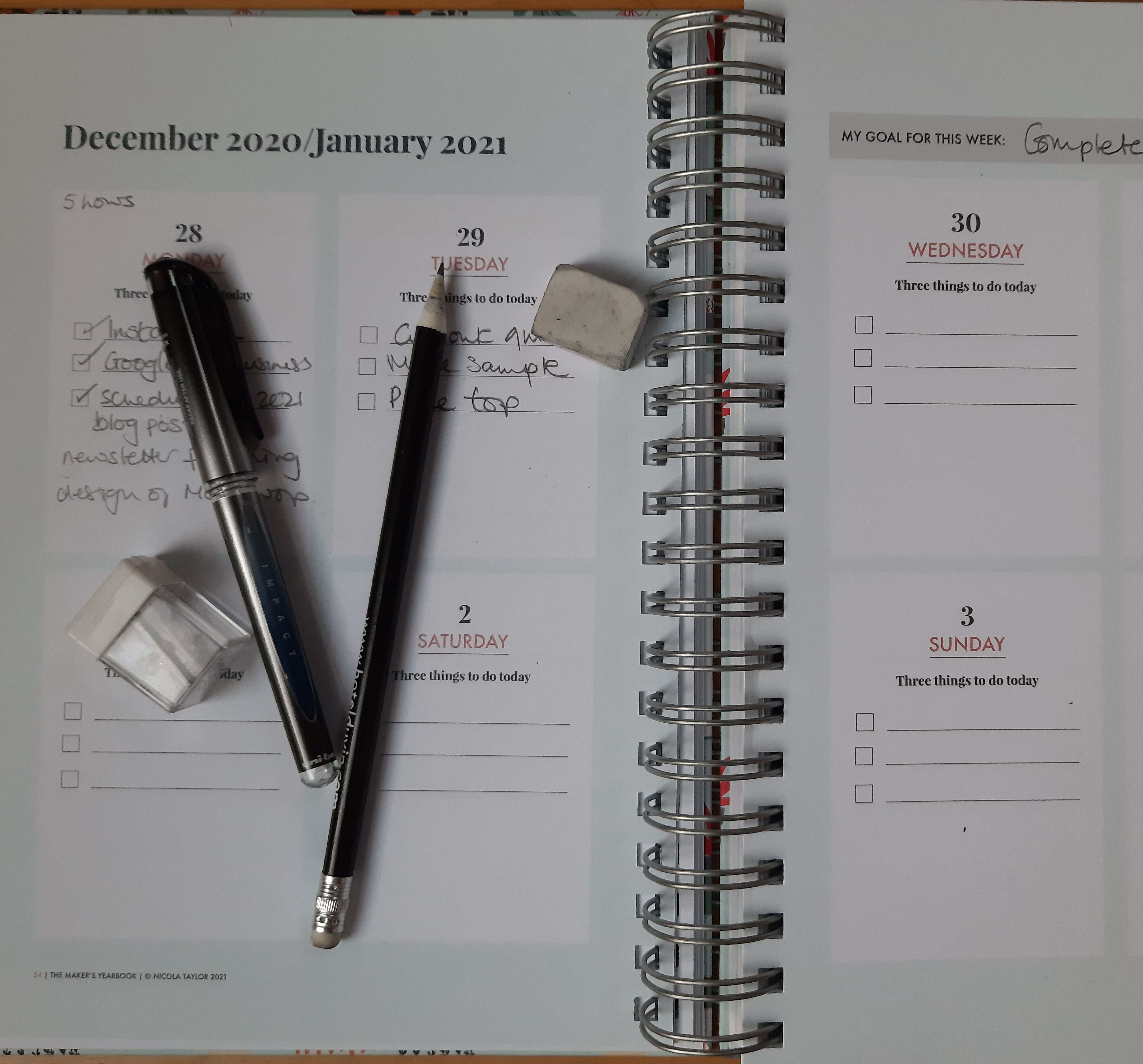 Everyone who is able to work from home (rather than going to the studio) has been asked to do that, so that’s what I’m doing. I have some great planning tools. I love ‘The Maker’s Yearbook’ designed by Nicola Taylor, which I am using for the second year running.