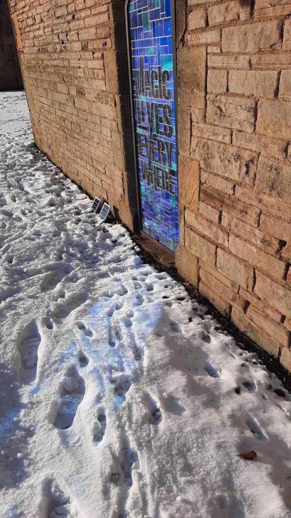 Near to it is ‘Magic Lives Everywhere’ by Stuart Langley, a glass piece set into a doorway.