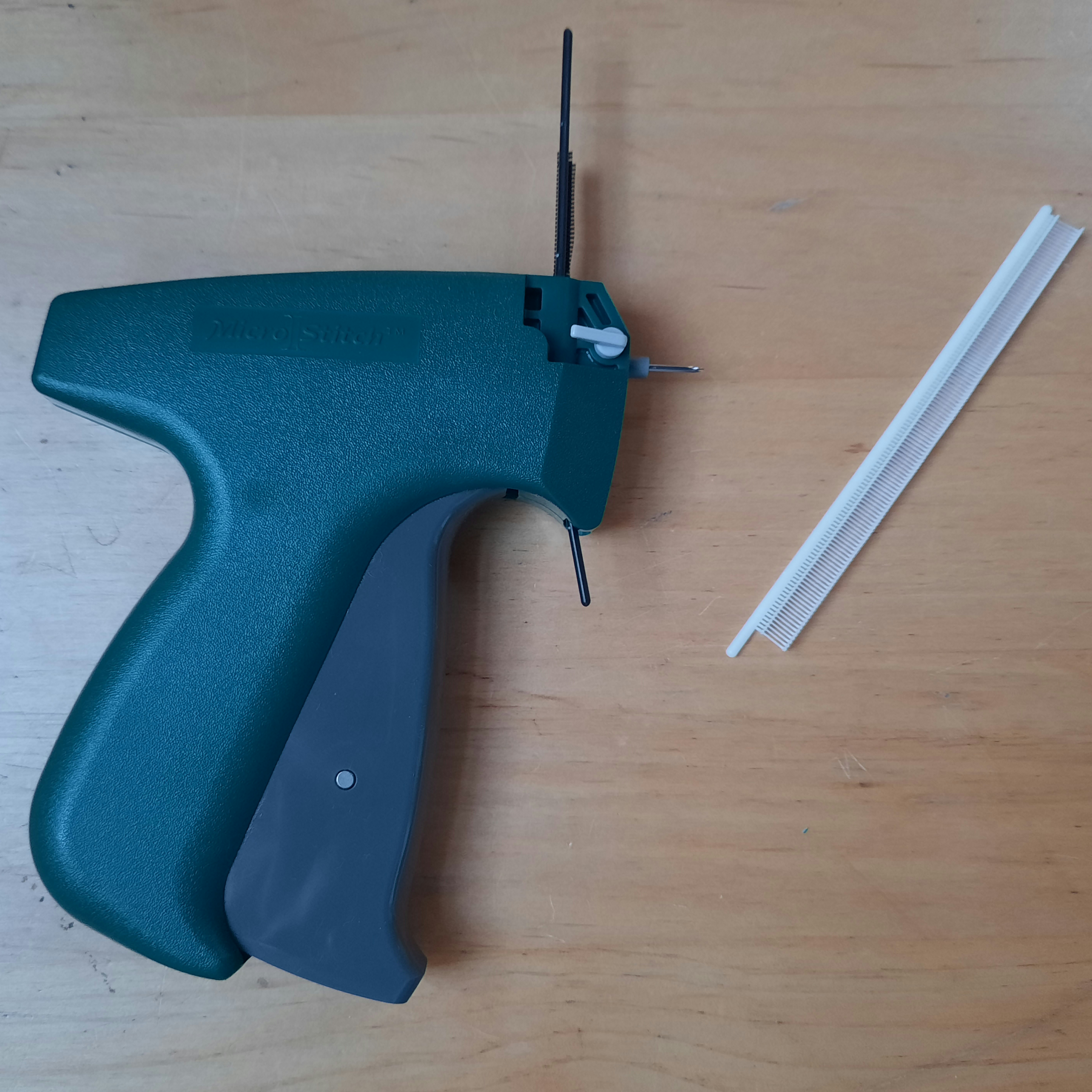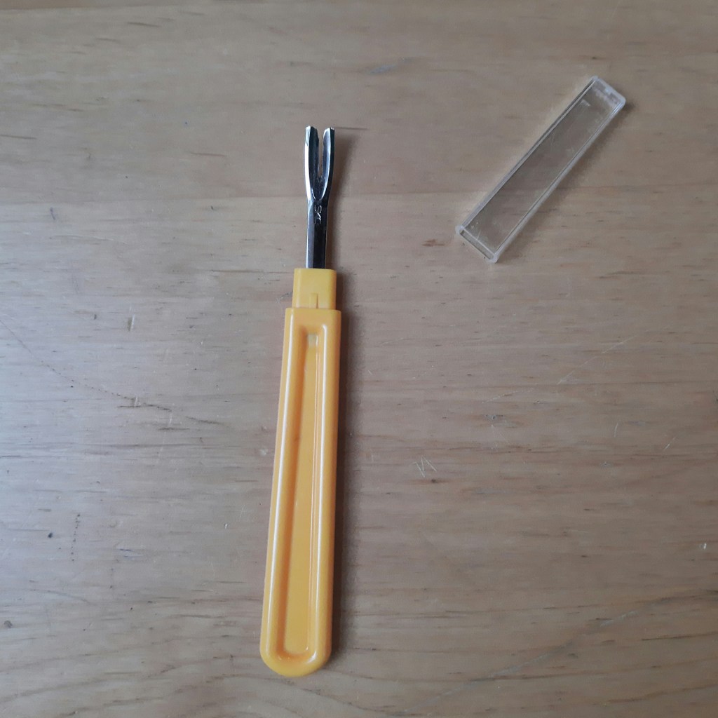This gadget is very similar to those used to shops to attach price tags to textile items. The one here is called ‘Micro Stitch’ and is manufactured by Avery. The point is inserted through the fabric and the trigger sends a small plastic tack with a bar at each end into the fabric. The bar at the top of the tack will rest on the surface of the backing fabric and the bar at the bottom of the tack will rest on the surface of the quilt top. In the photo you can see a strip of white plastic tacks lying on the table on the right. A row of black plastic tacks is already inserted in the gadget. Just like choosing tacking thread, you should choose a colour that will show up on your quilt: white on a dark quilt and black on a light quilt. A good way of ensuring that you have pierced all three layers of your quilt is to insert an old racquet (tennis or squash) under your layered up quilt, which will slightly lift the layers and provide space for the micro-tacker to do its work. This tip comes from Barbara Weeks, former tutor on the City & Guilds Patchwork & Quilting Certificate course at Missenden Abbey several years ago. Putting the tacks in is one thing, but you do have to also take them all out. For this you need a specialist tack lifter, which you insert under the top bar, cutting through the tack.