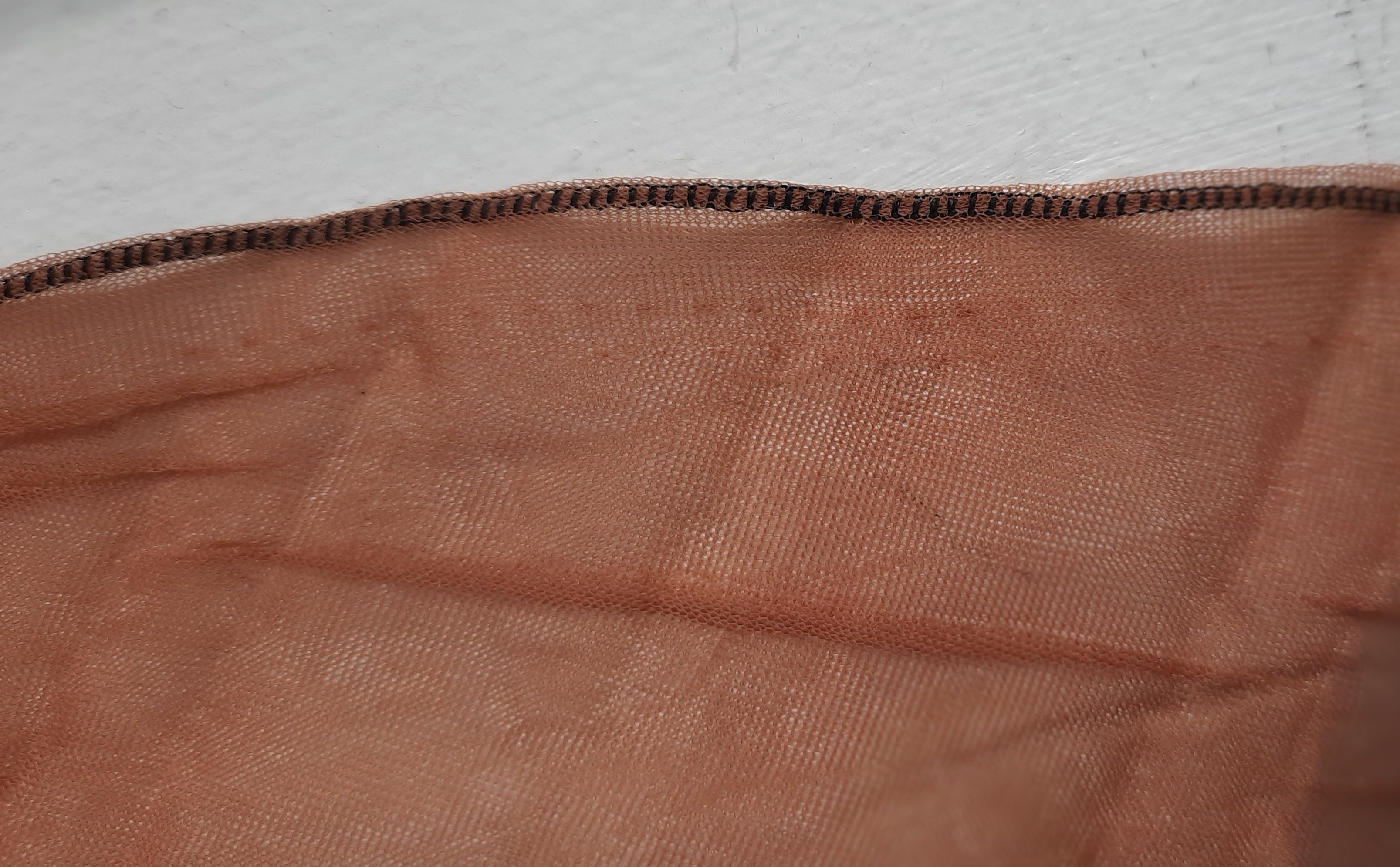 The stocking came off complete. It shows signs of wear on the foot and there is a carefully mended ladder near the top. It has a stitched back seam which is visible on the inside of the curve in the photo. The second stocking did not come off in one piece but on this one there is a very obvious, dark, back seam.