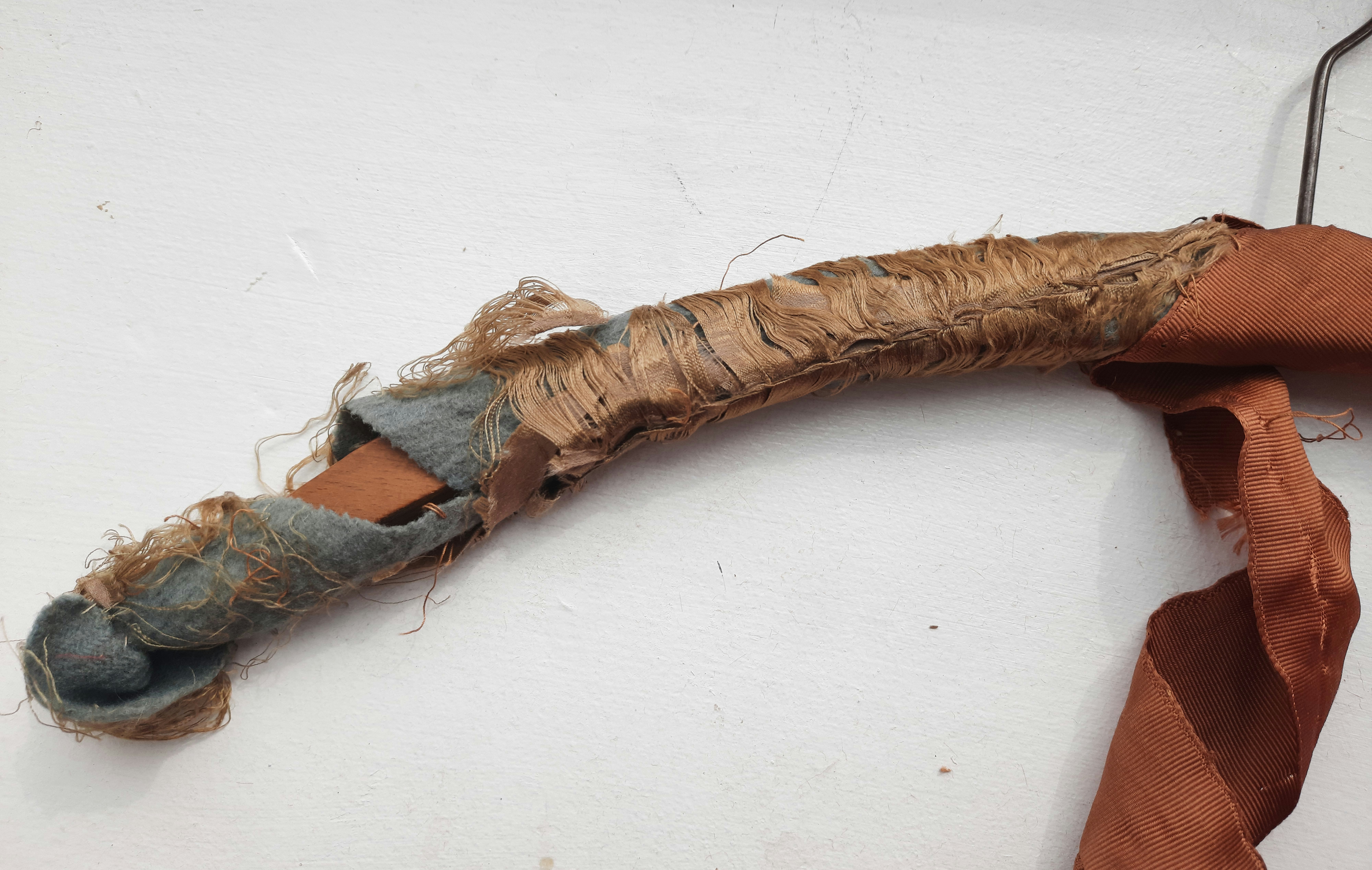 Having unpicked the top layer of each hanger, there were different arrangements beneath. This golden yellow hanger had a layer of wadding carefully bound onto the hanger with strong thread.