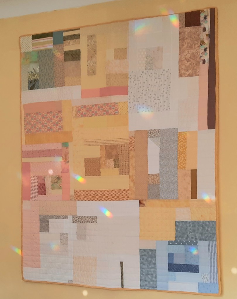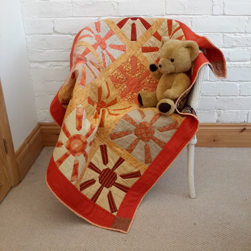A quilt measuring 36 x 48″ (91 x 122cm) makes a good-sized cot quilt, but a smaller cover for a buggy is also possible. Below is an example of a baby quilt made to commission. ‘Burnt orange’ was specified as the main colour and ‘suns’ given as the theme by person who now owns the quilt (in Australia).
