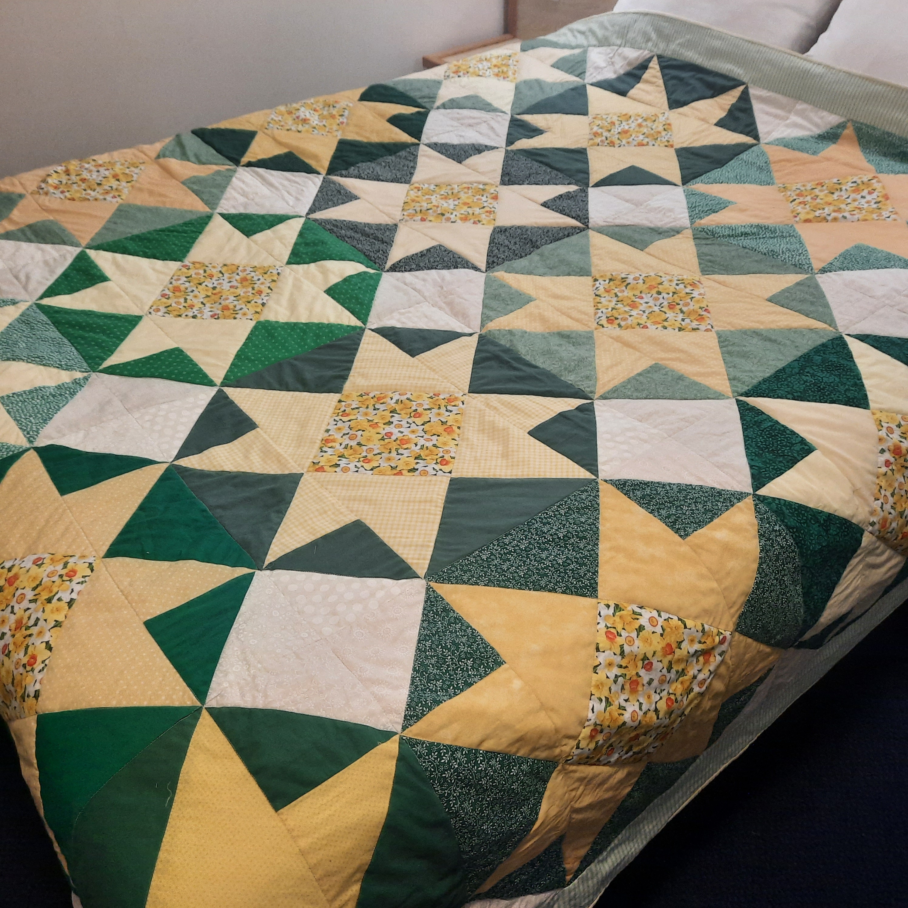If the quilt is for couple, it’s particularly important to take into account the colour and design choices of both partners. You might choose to meet with the designer maker (online or in person) to look at actual colour swatches of material to help narrow down the preferences of both people who will sleep under the quilt. The quilt below was made for a couple who wanted daffodil colours (dark yellow, paler yellow and green). In the end, a daffodil print fabric was used in the centre of each block, though the other colours in each block varied across the quilt.