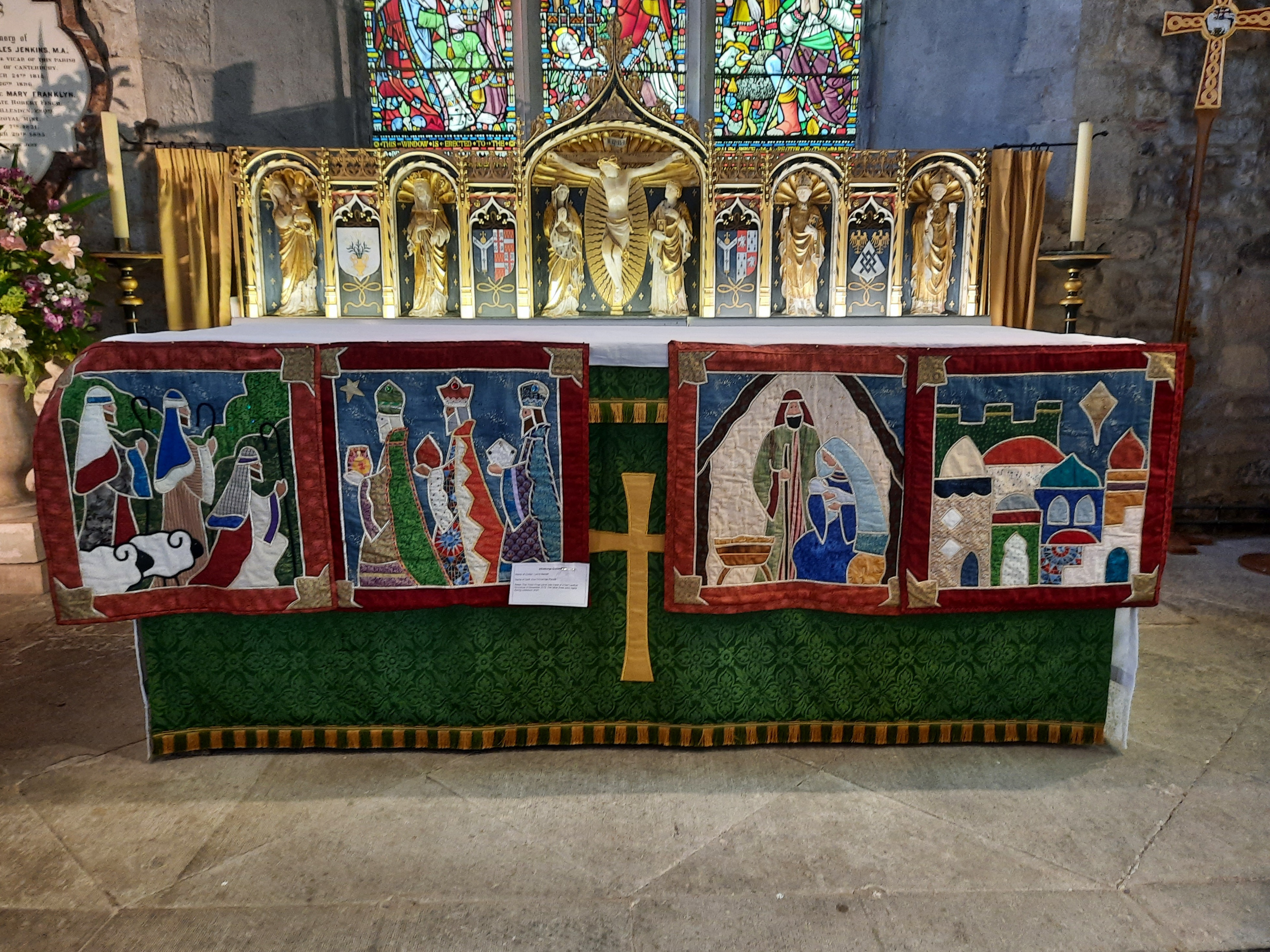 The area of the church around the altar was dedicated to quilted items with Christmas themes, including panels of the Nativity by Lynne Newell, seen on the altar front.