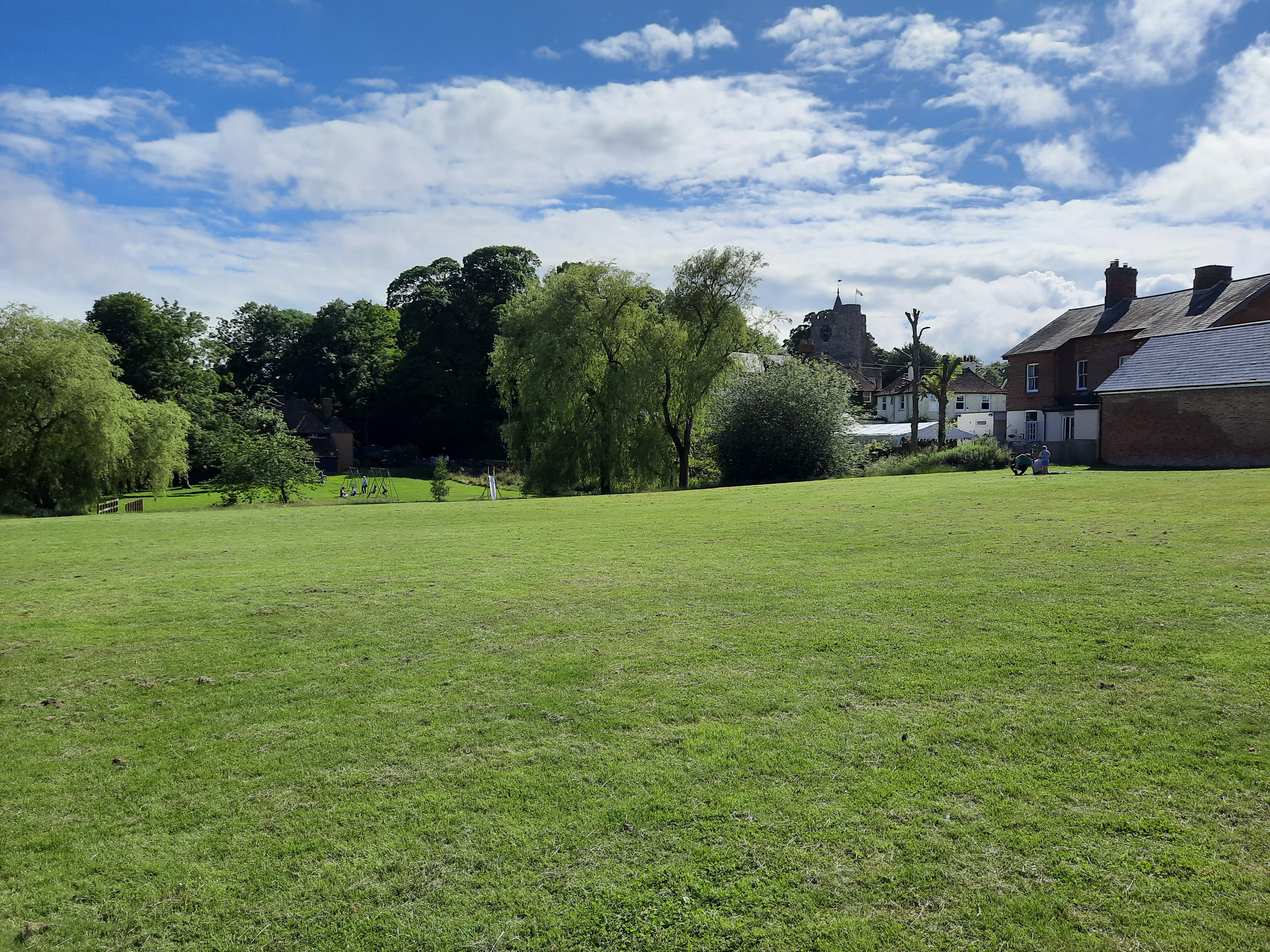A view of St Ethelburga's church in Plyminge, Kent showing grass, trees and houses, with the church in the distance