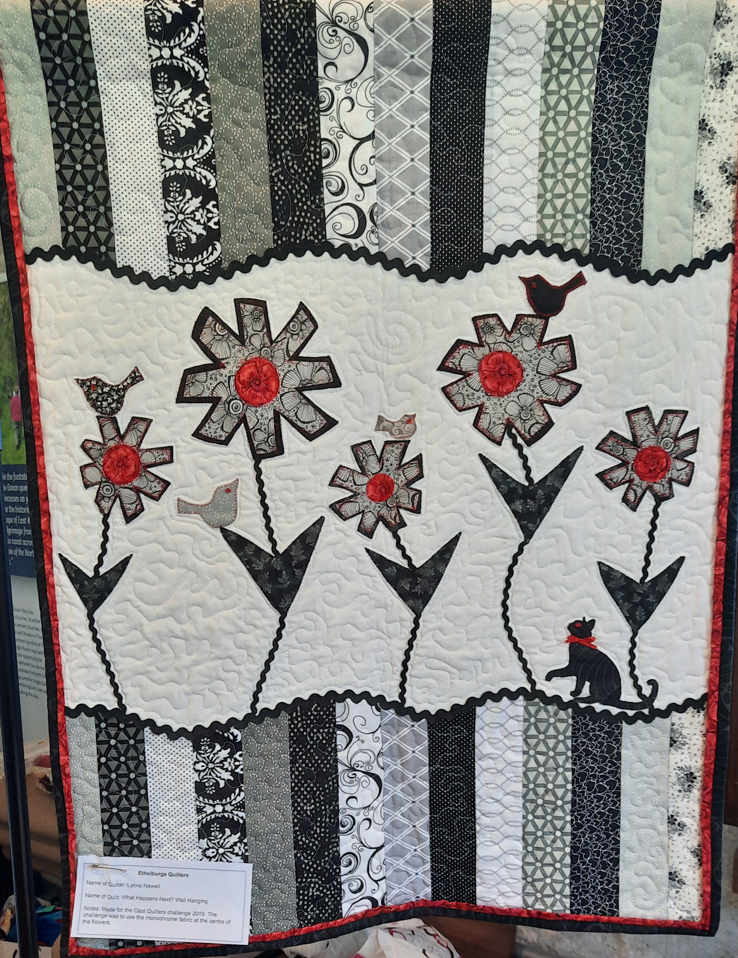 Black and white quilt with touches of red, depicting flowers leaves, a bird and a cat set against a background of stripes: 'What happens next?' wall-hanging by Lynne Newell