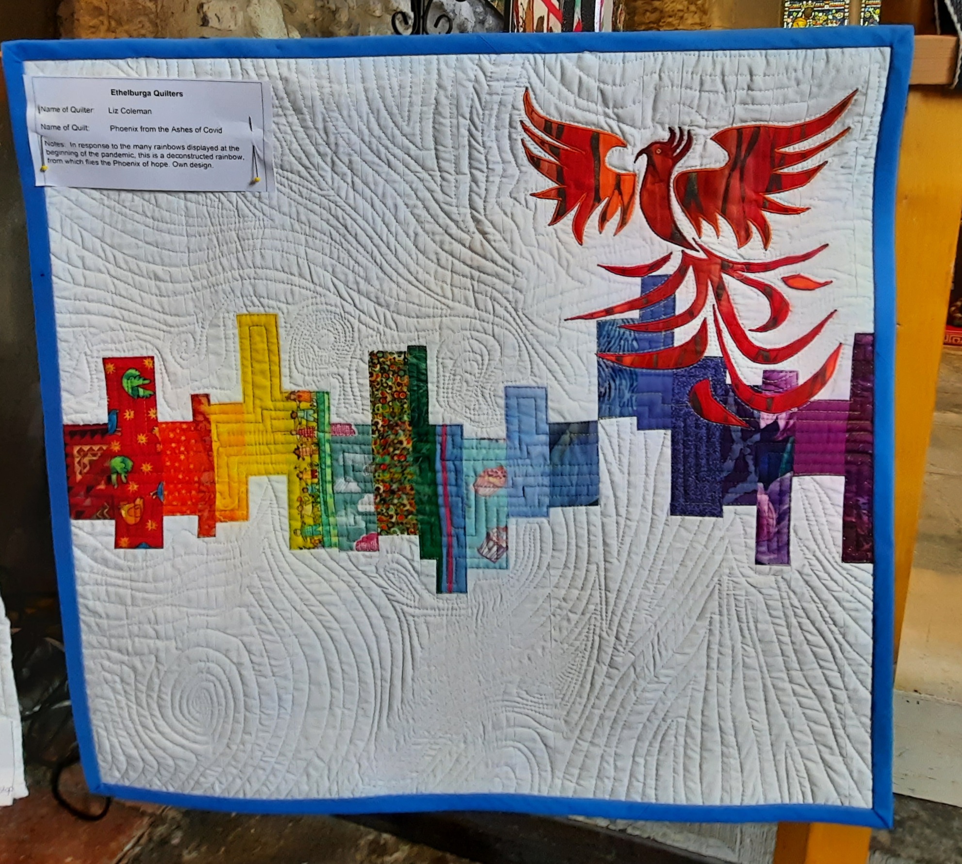 The quilts on display were all made by members of Ethelburga’s quilt group, which is led by Liz Coleman. A stunning small quilt entitled ‘Phoenix rising from the Ashes of Covid’ designed and made by Liz was on display at the front of the church. It depicts ‘a phoenix of hope’ rising from a ‘deconstructed rainbow’ (the rainbow having been frequently used as a symbol in the UK during the pandemic).