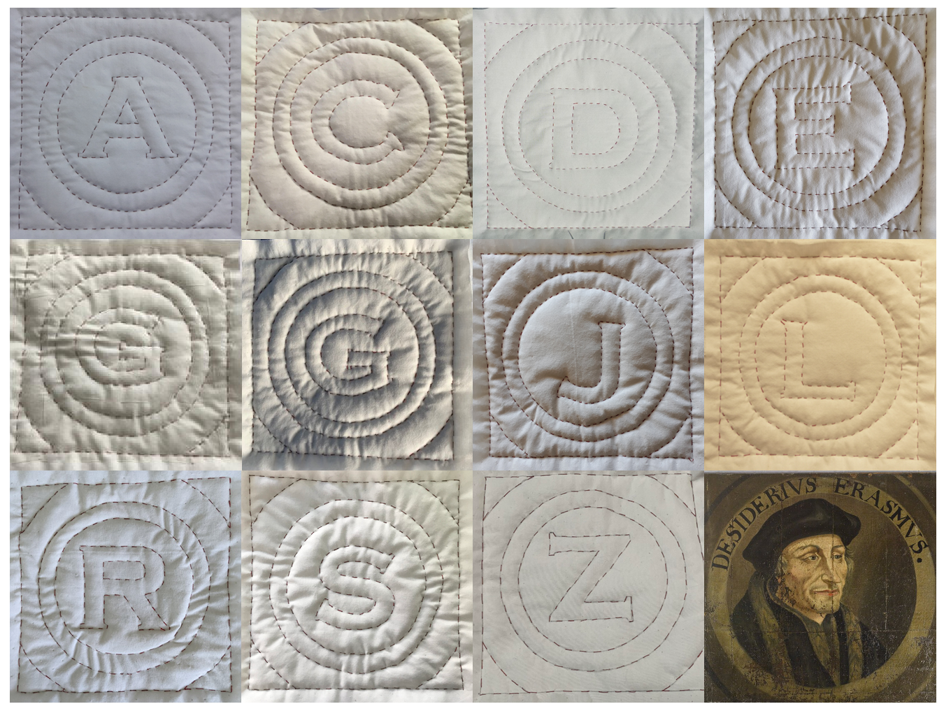 I had the opportunity to look inside the library, while it was under restoration. In the photo above, you can see how beautiful it is now. I was struck by the design of the roundels that decorate the area immediately above the bookshelves. This became part of the inspiration for the design for the hand-quilted project each participant completed on the workshop. It seemed appropriate to concentrate on letters (since it’s a library we are dealing with), so a letter within a roundel (just as the portraits are inside a roundel) went into the design. As it is a seventeenth-century library, I looked for a historic typeface that would made reference to the print in books of the time. The letters appeared in capitals, to fit within the rounded shape of the frame.