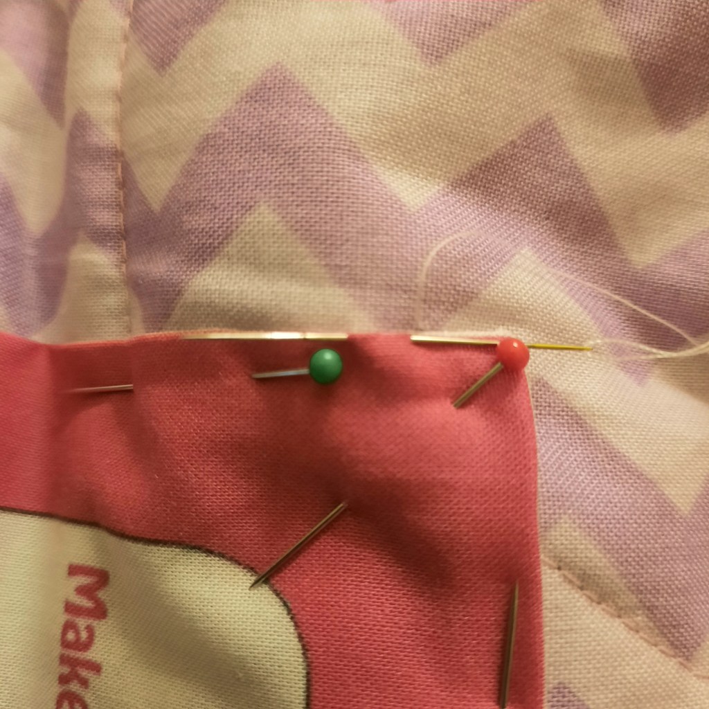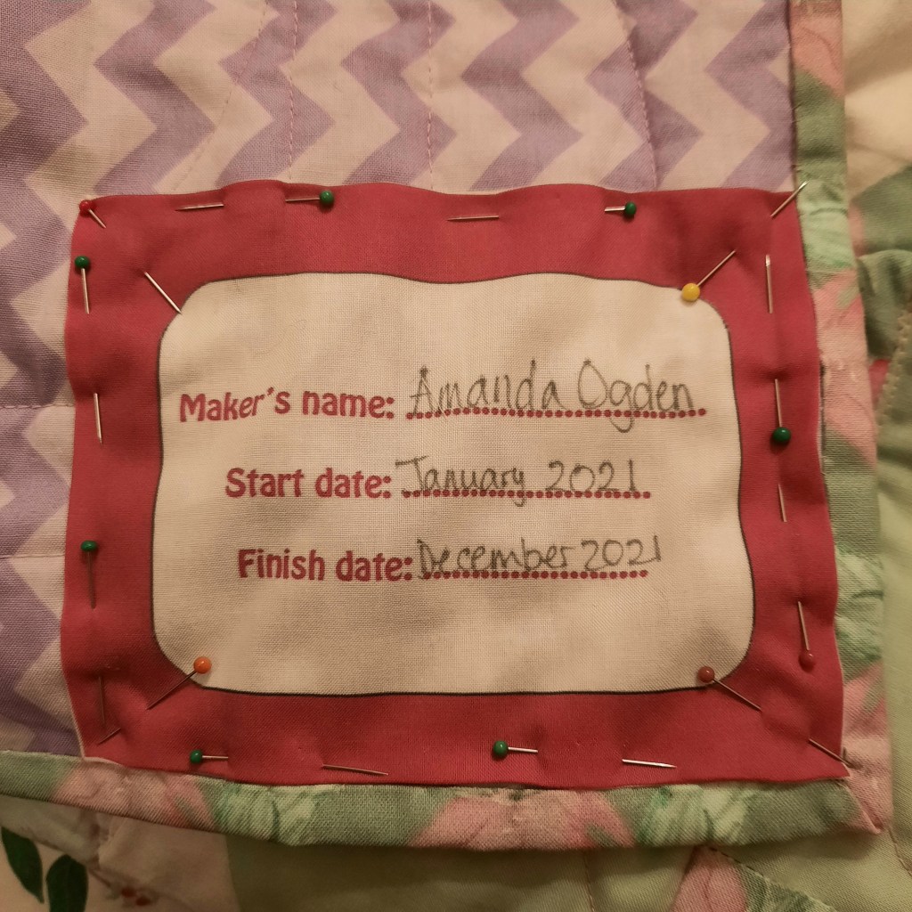 4 Pin the label to the quilt. For the ‘Summer Bouquets’ quilt, I have placed it in the bottom right-hand corner of the back, just inside the binding.