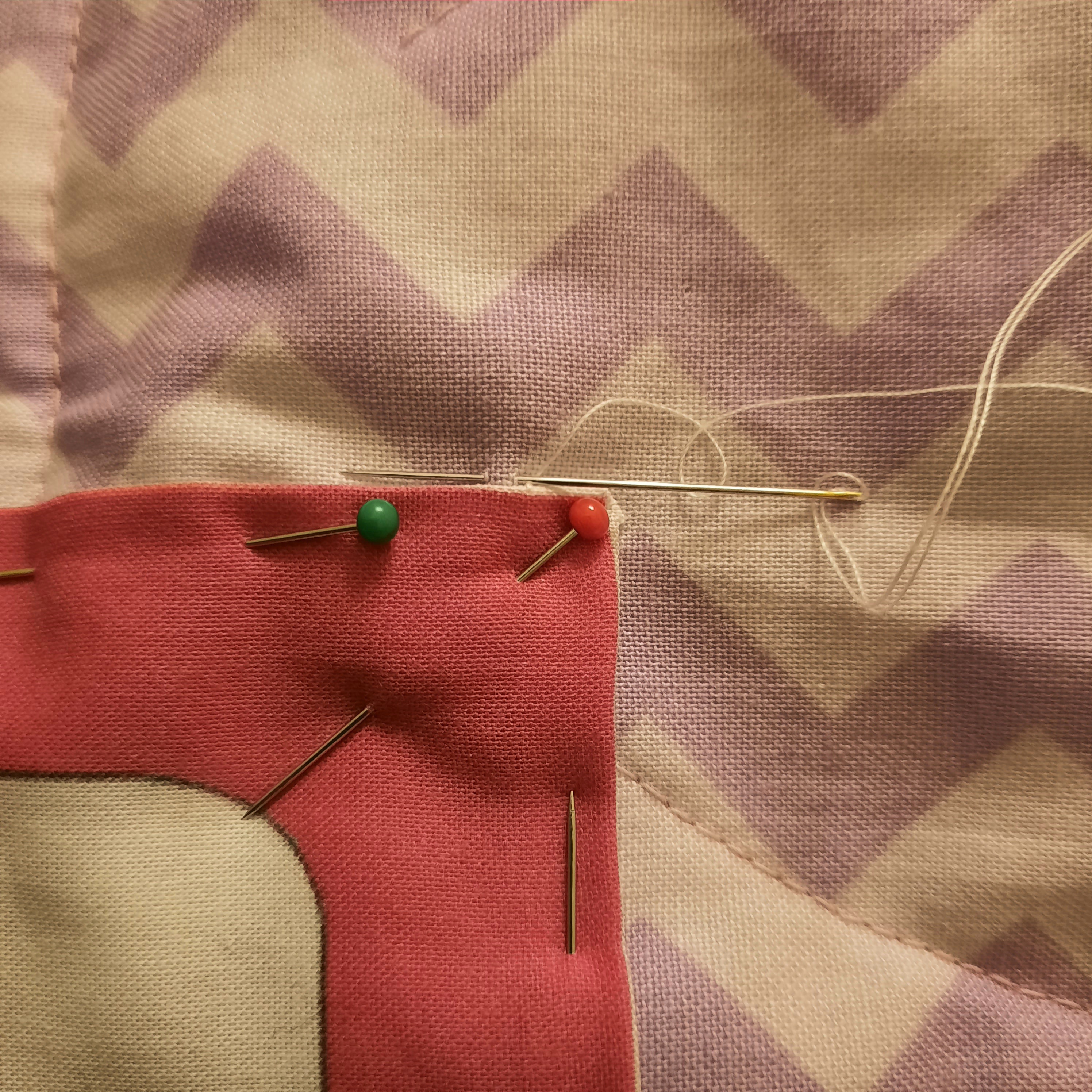 5 Stitch the label to the quilt back with a slip stitch. Secure your thread, then take a small stitch in the backing fabric.