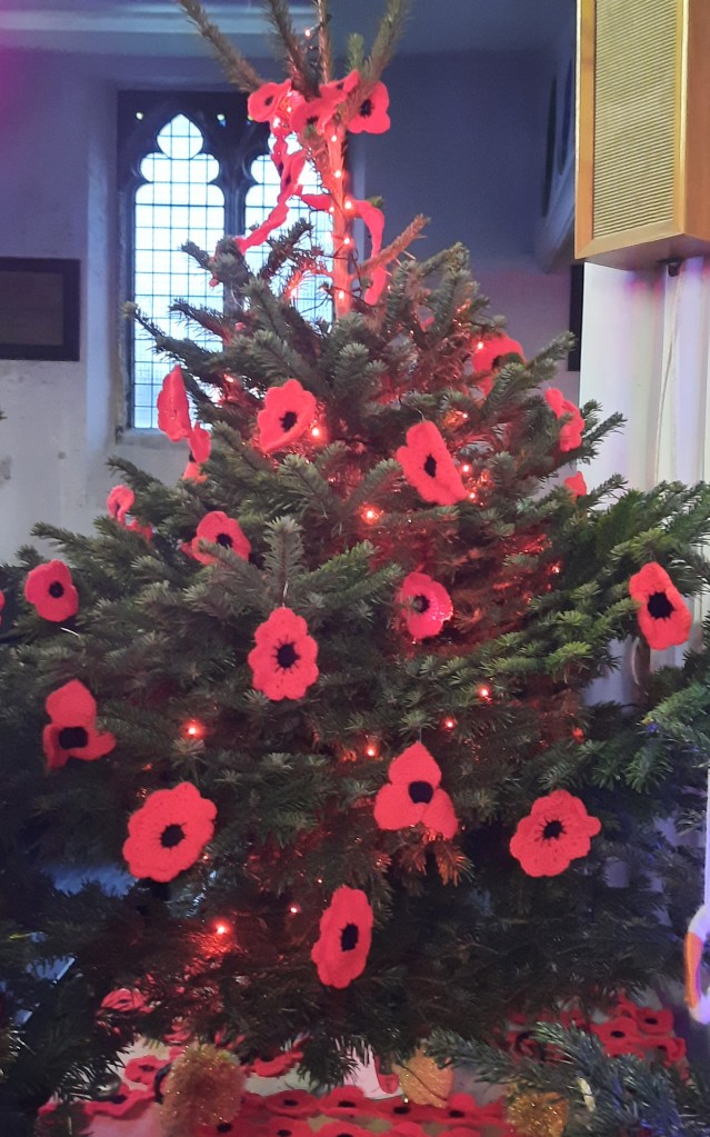 The group which produces red poppies for Remembrance Day contributed a tree. These knitted flowers are all handmade.