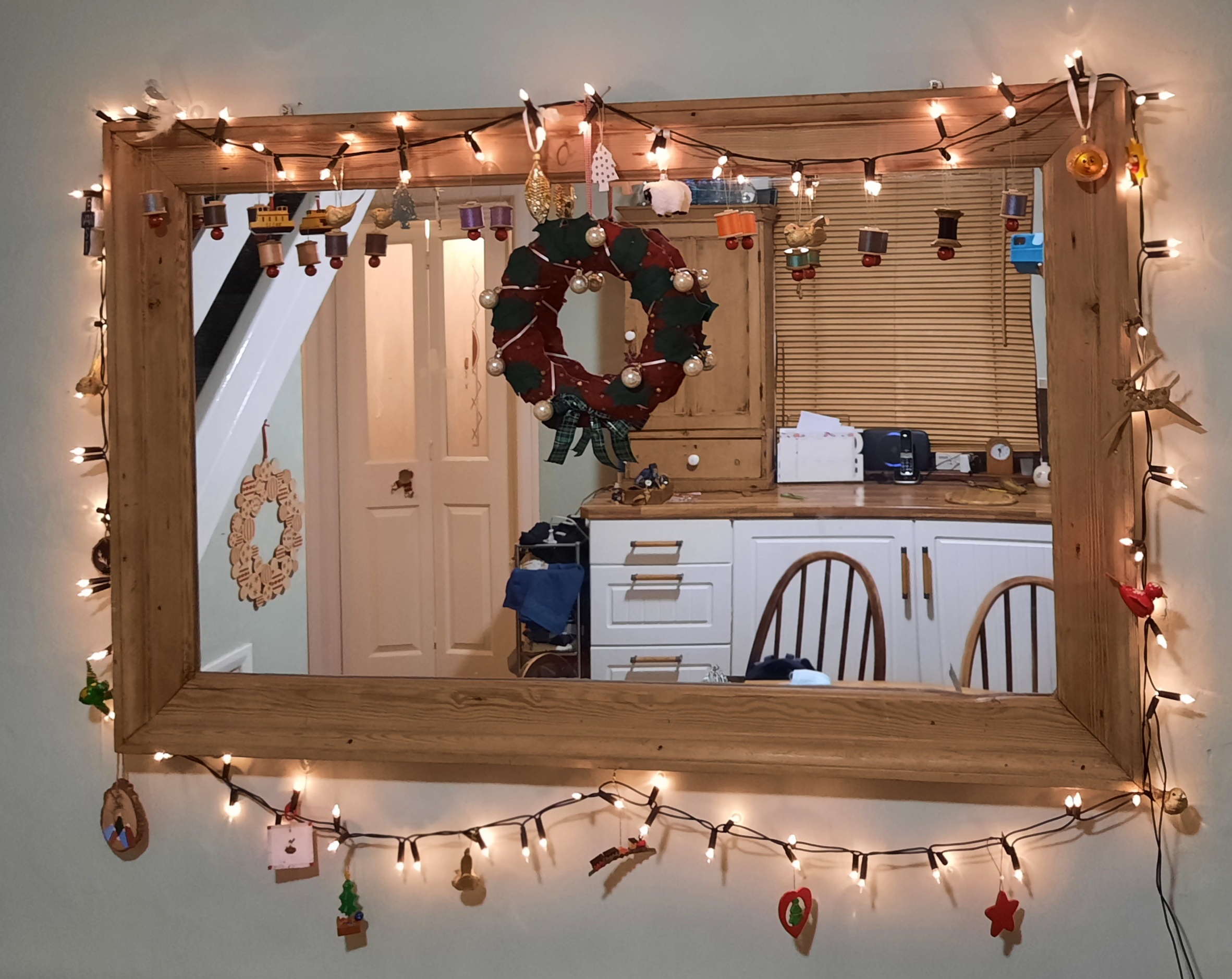 Below you can see a fabric wreath, made with Amanda Jane Textiles pattern Holly Berry Christmas Wreath. It is pinned above the mirror in my kitchen and around the mirror are lights hung with some of my cotton-reel decoration and various quirky decorations gifted and gathered over the years. Sending love to you today, from my house to yours. May you find light in the darkness this Christmas. Amanda