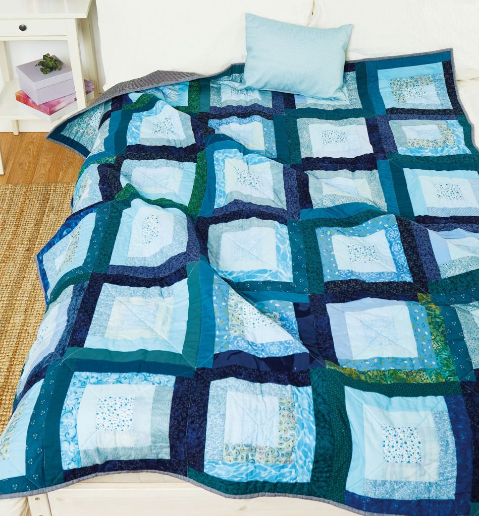 The finished size is 60 x 72″ (152 x 183cm) but the quilt pattern uses 12″ (30cm) blocks, so it would be easy to enlarge the design to make a bigger quilt. It is a scrap-friendly quilt. As you can see from the photo above, several different ‘watery’ fabrics were used. As with all my quilt patterns, there are clear instructions and accompanying photos in colour. You can find the pattern in the Etsy shop here