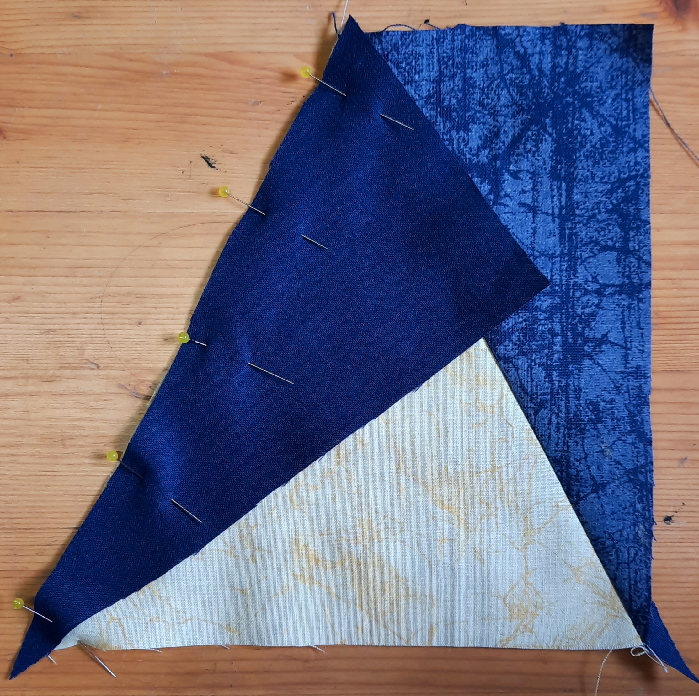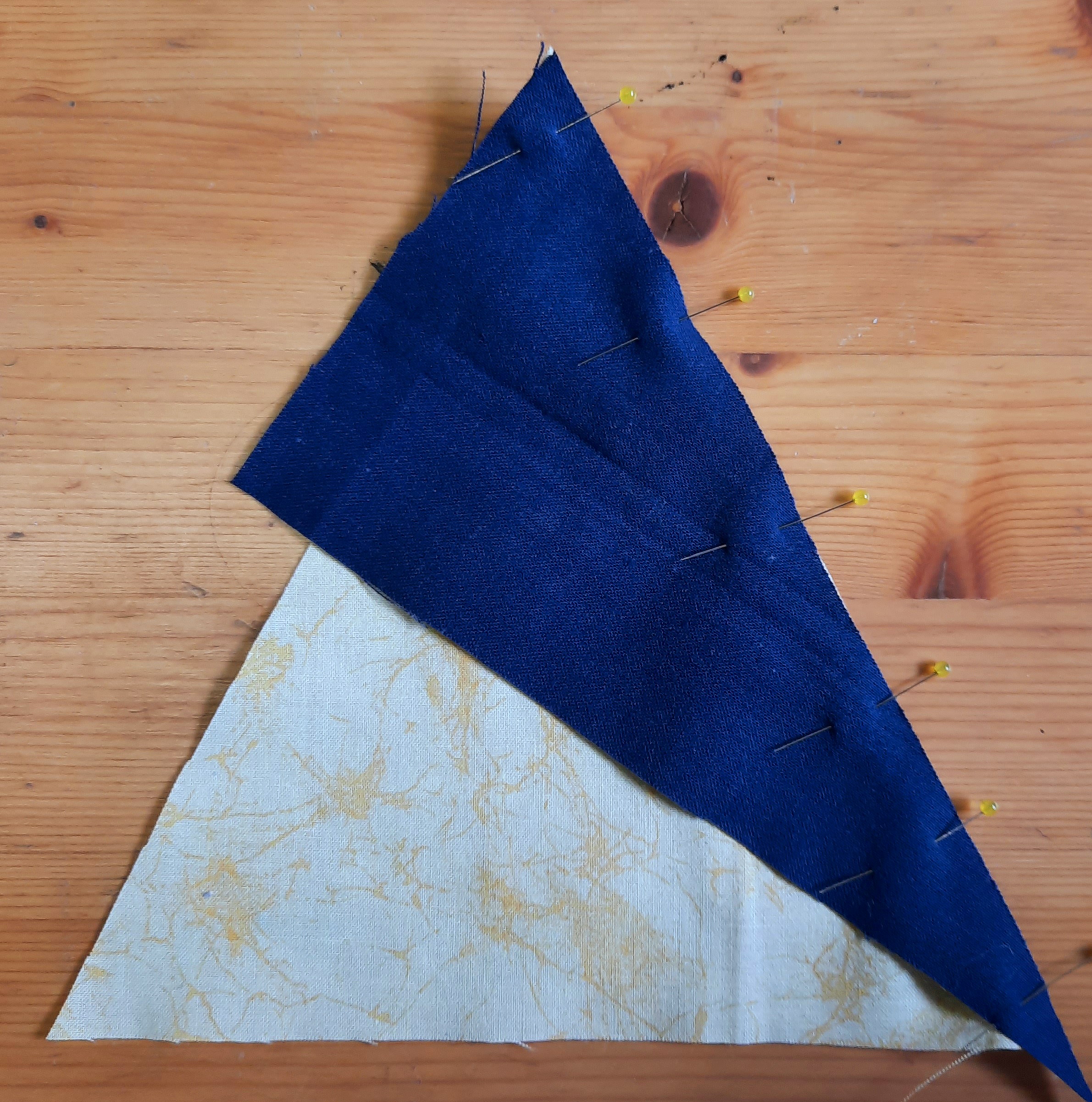 1 Pin a blue ‘right-hand’ triangle to the right-hand long side of the yellow triangle, as shown.