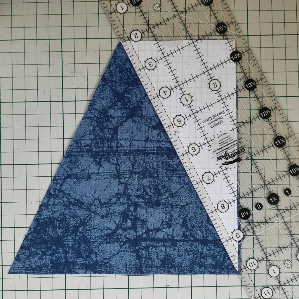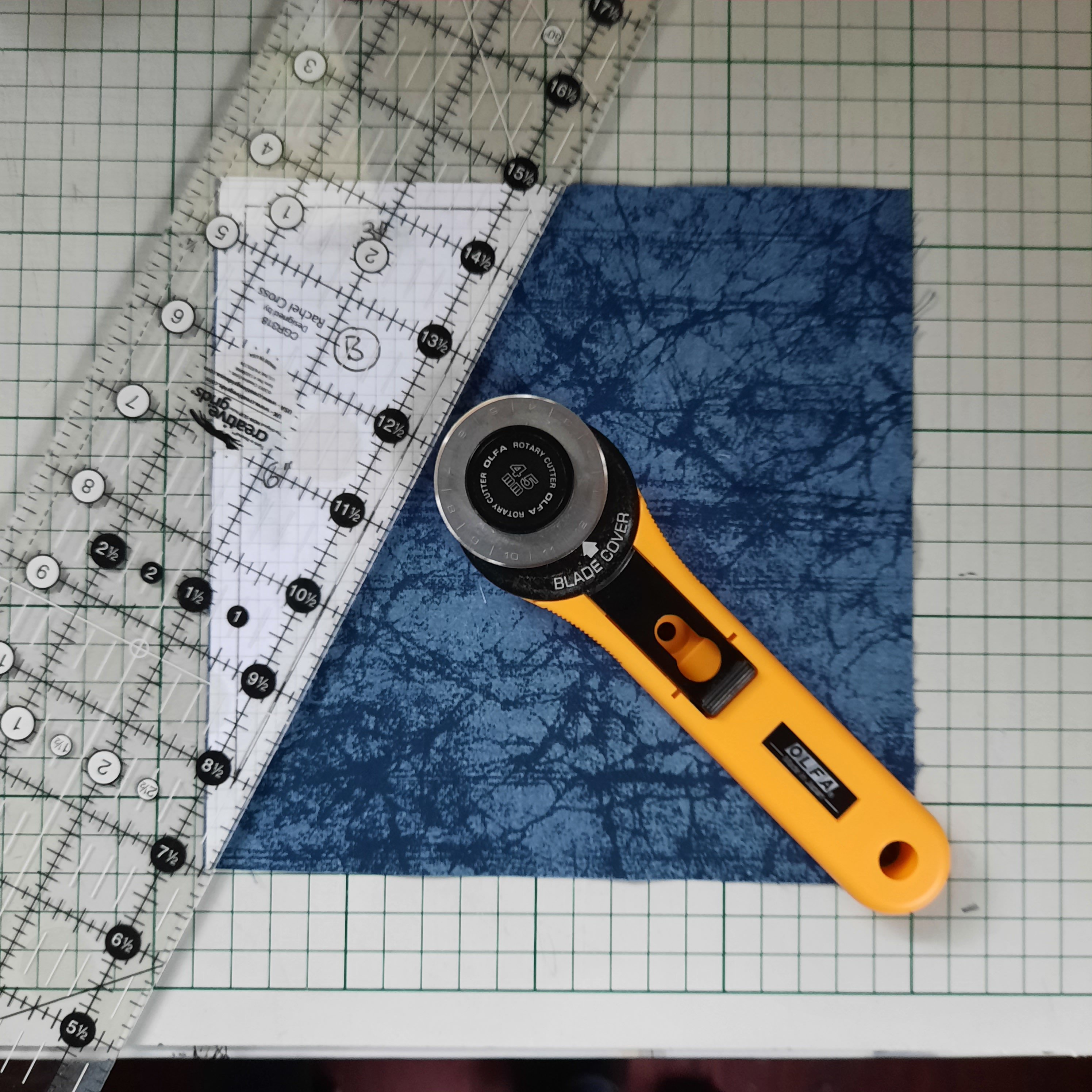 Then turn over your template to the un-marked side and place it in the top right-hand corner of the remaining piece of your original rectangle and cut down the long side of the template as before. This makes a ‘right-hand’ triangle. (You will obviously need to turn your cutting mat to use the ruler safely – the photo below is to show the position of the template in relation to the one above!) You need to cut 12 ‘left-hand’ triangles and 12 ‘right-hand’ triangles of the navy fabric.
