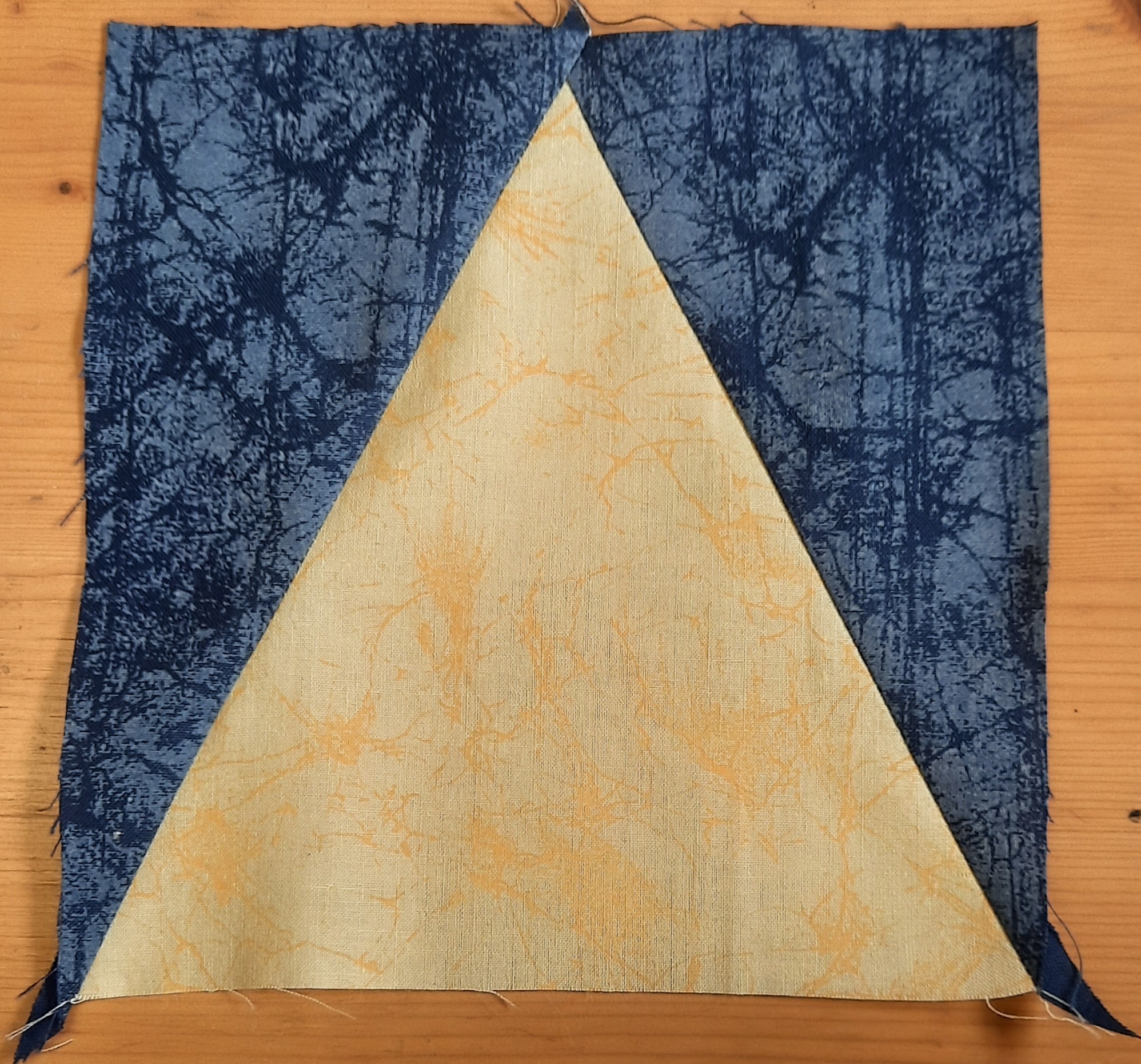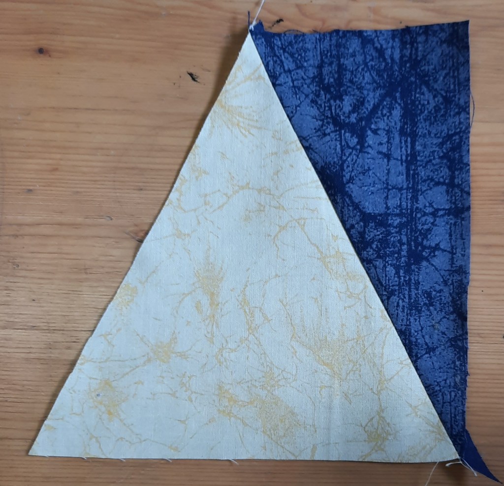 3 Pin a ‘left-hand’ triangle to the left long side of the yellow triangle. Stitch and press as before.