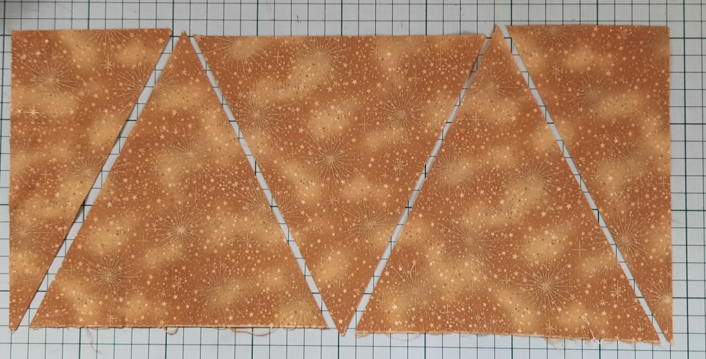 Cut 12 triangles of yellow fabric using template A. These shapes tesselate if you rotate the block, as shown below. (I used gold stars on a dark yellow background for one of my fabrics.