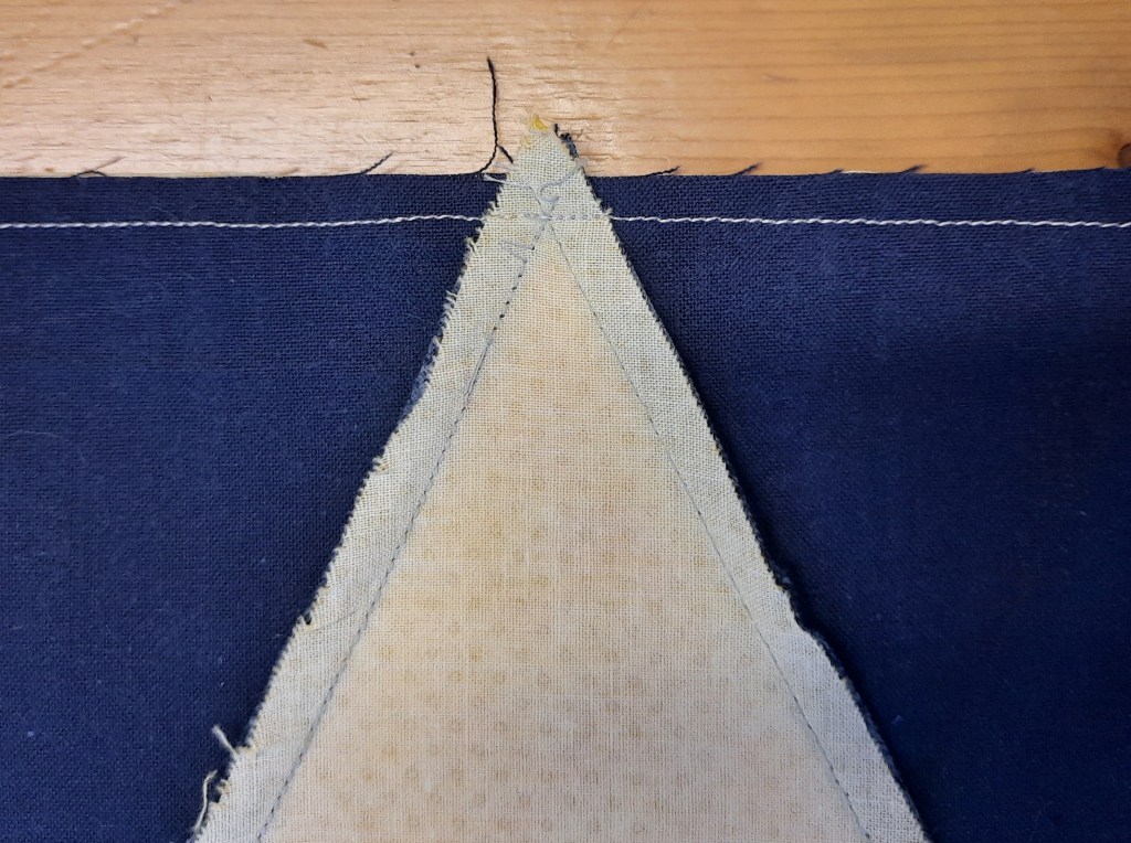 5 Join the blocks in sets of three. Make sure that the seam crosses the tip of the yellow triangle, as seen in the photo.
