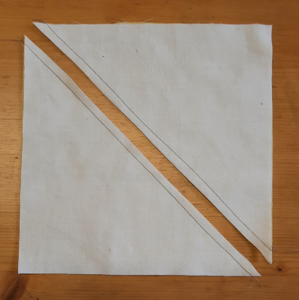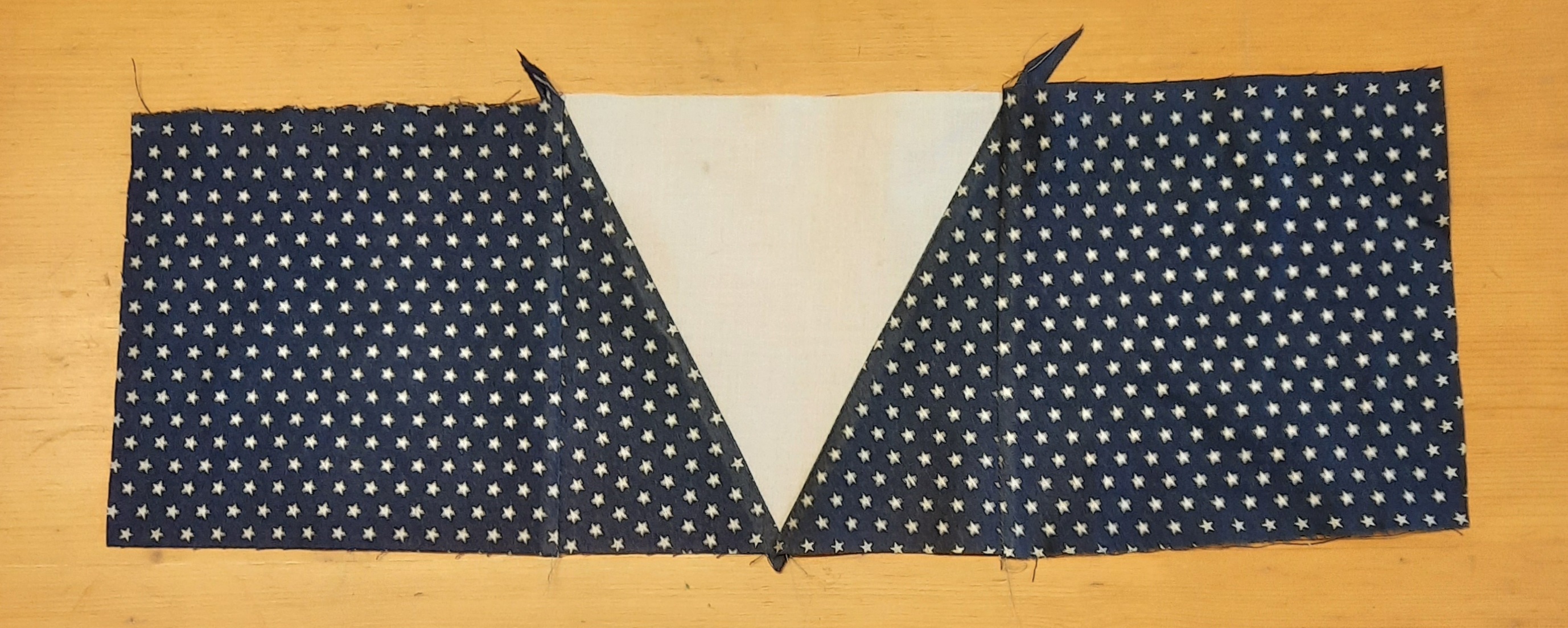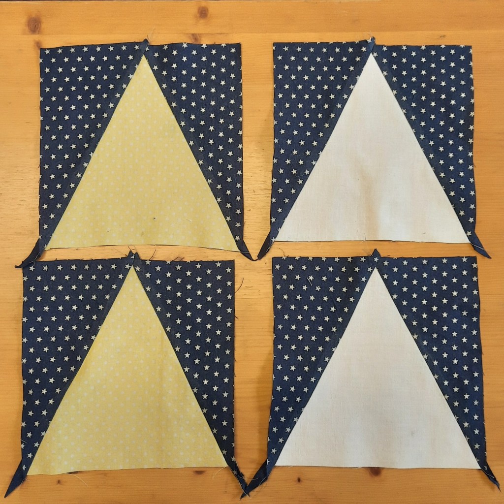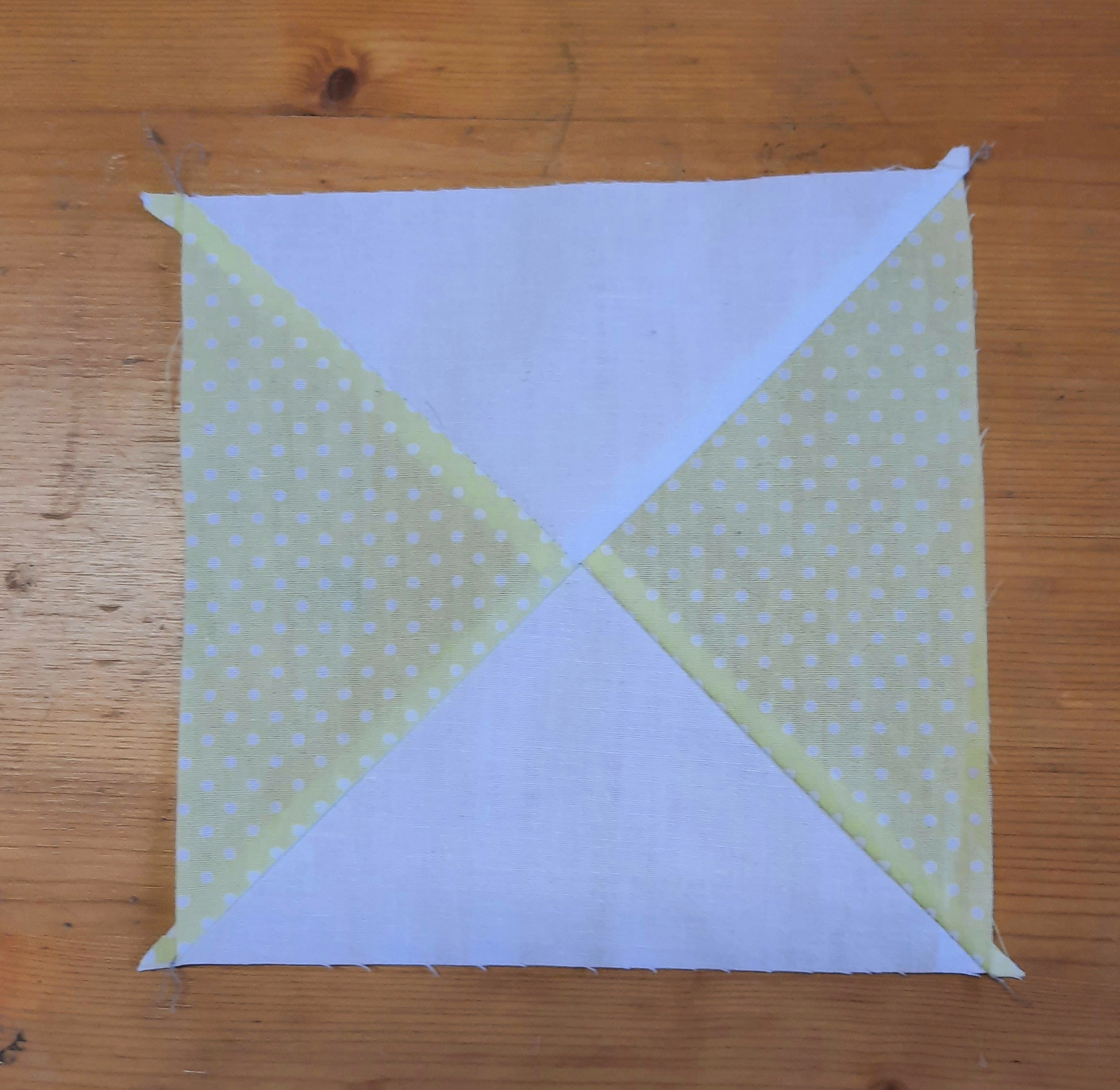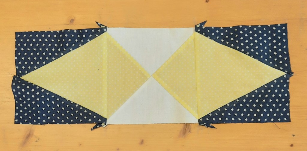 4 Press the seam, then open the triangles and press the seams allowances towards the yellow fabric.