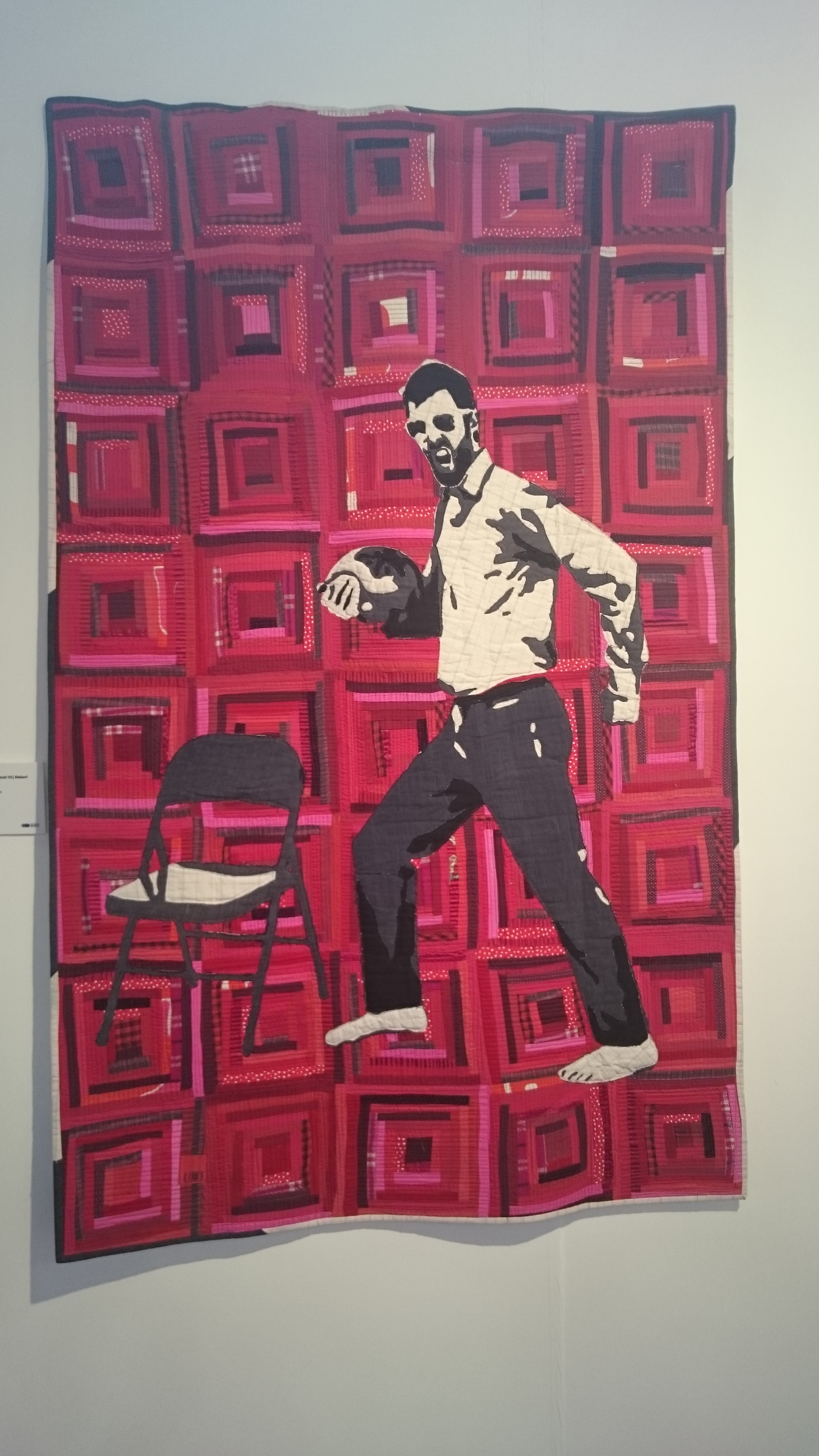 Luke spoke about this quilt and others in a series of portraits, using appliqué on top of pieced log-cabin quilts. Luke frequently uses ‘pre-loved’ fabrics in his work. Several of the portraits were made using the garments of the subjects. The person posed for photographs and then left the garments they had been wearing behind in the studio, which were then cut up and used in the appliqué version of their form. Ingenious!