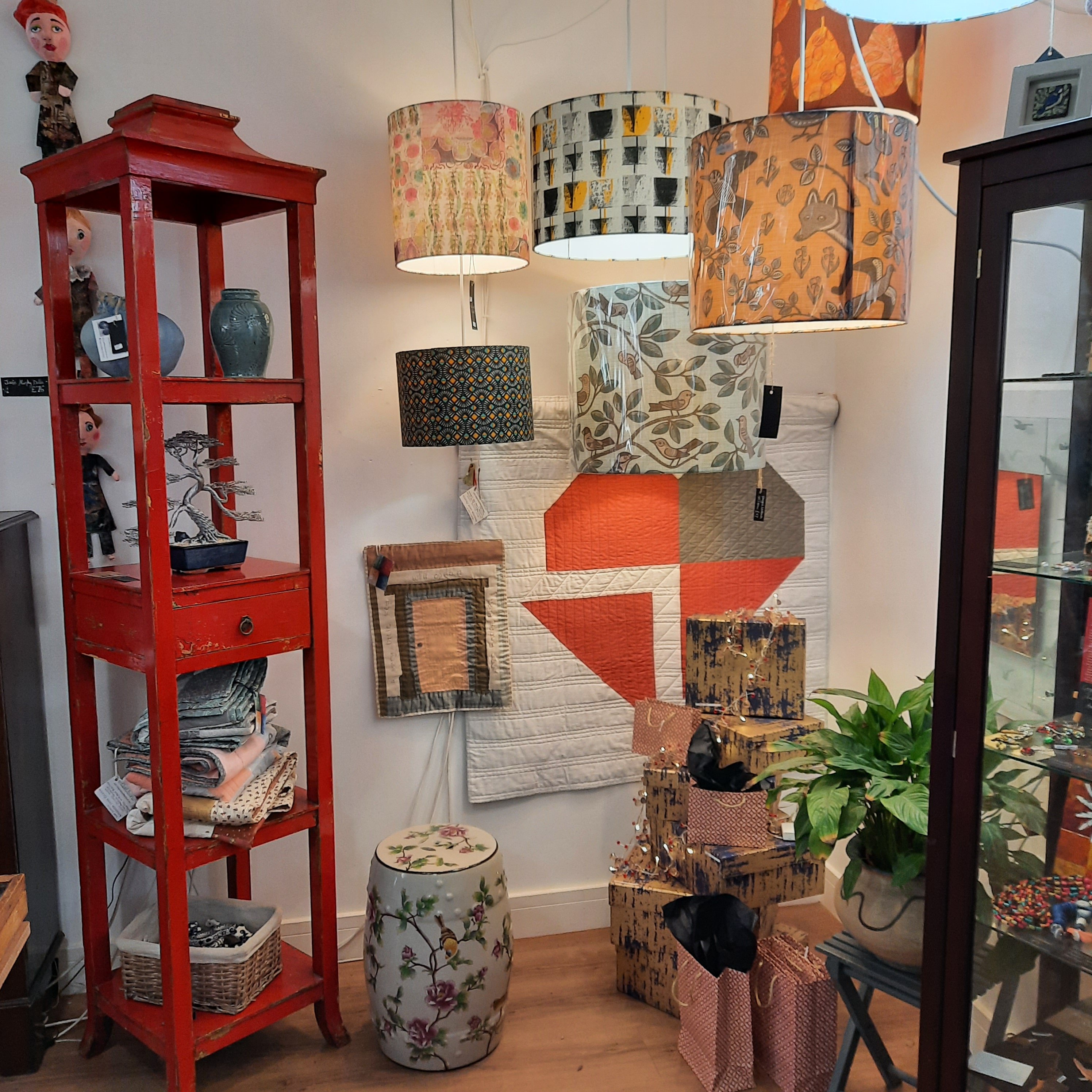 At the moment, some of my own work is for sale in the shop.On the wall at the back, you can see my wall-hanging ‘Heartfelt’, to the left of it is ‘A little key can open a big door’ and to the left again, lying folded on the red stand are some more small quilts.