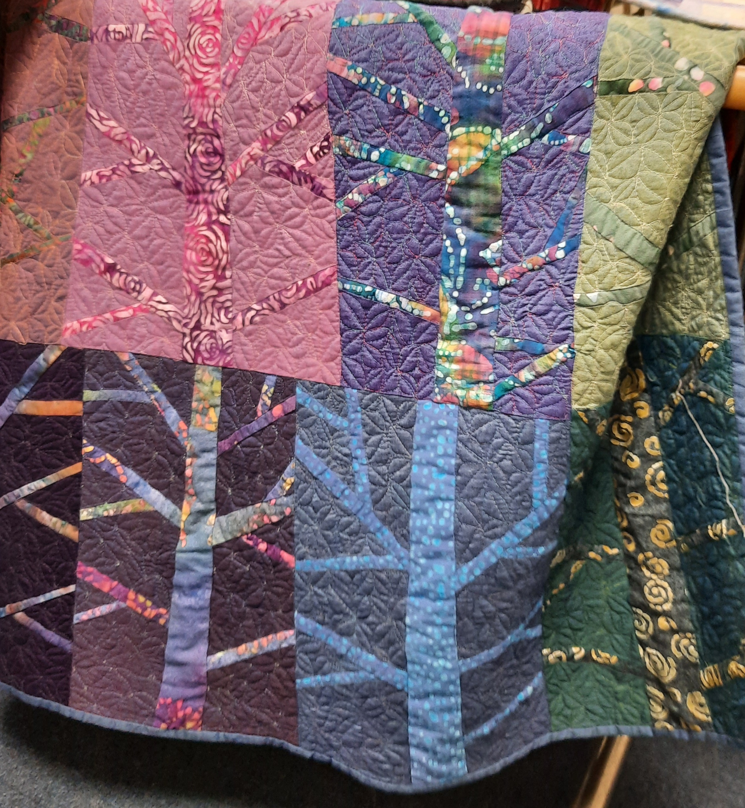 Helen Howes (pictured above) showed us a wide variety of her quilts as part of an examination in her talk of what makes a Modern (with a capital M) quilt. She emphasised, rightly, that she is a Textile Artist, using her skills in a modern (small m) way. Thus, some of the quilts we saw did fit the criteria for Modern Quilts, such as use of modern prints, simple quilting lines, negative space and some, she suggested, possibly didn’t! The debate about ‘Modern Quilts’ continues… Below is one of her lovely tree-themed quilts.