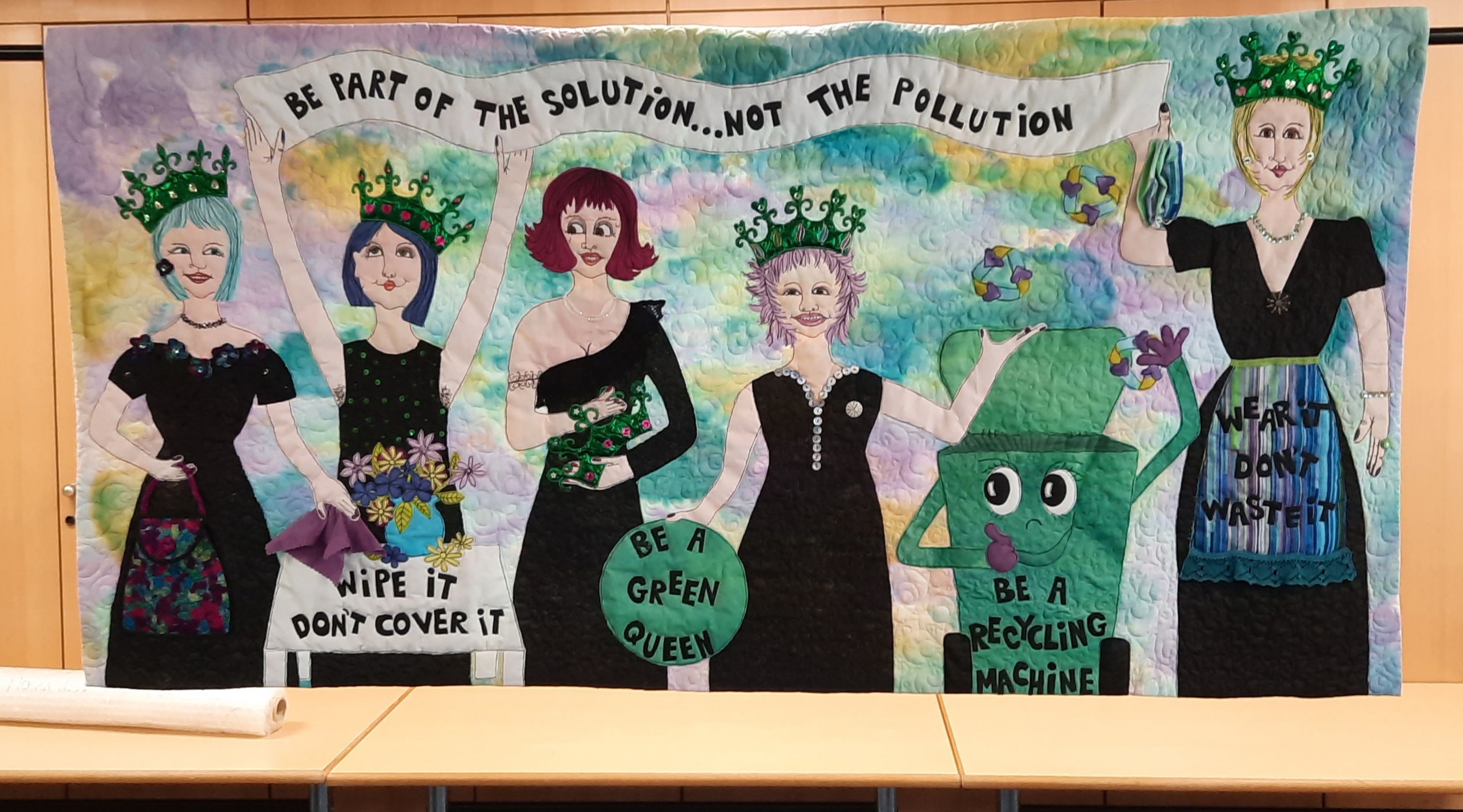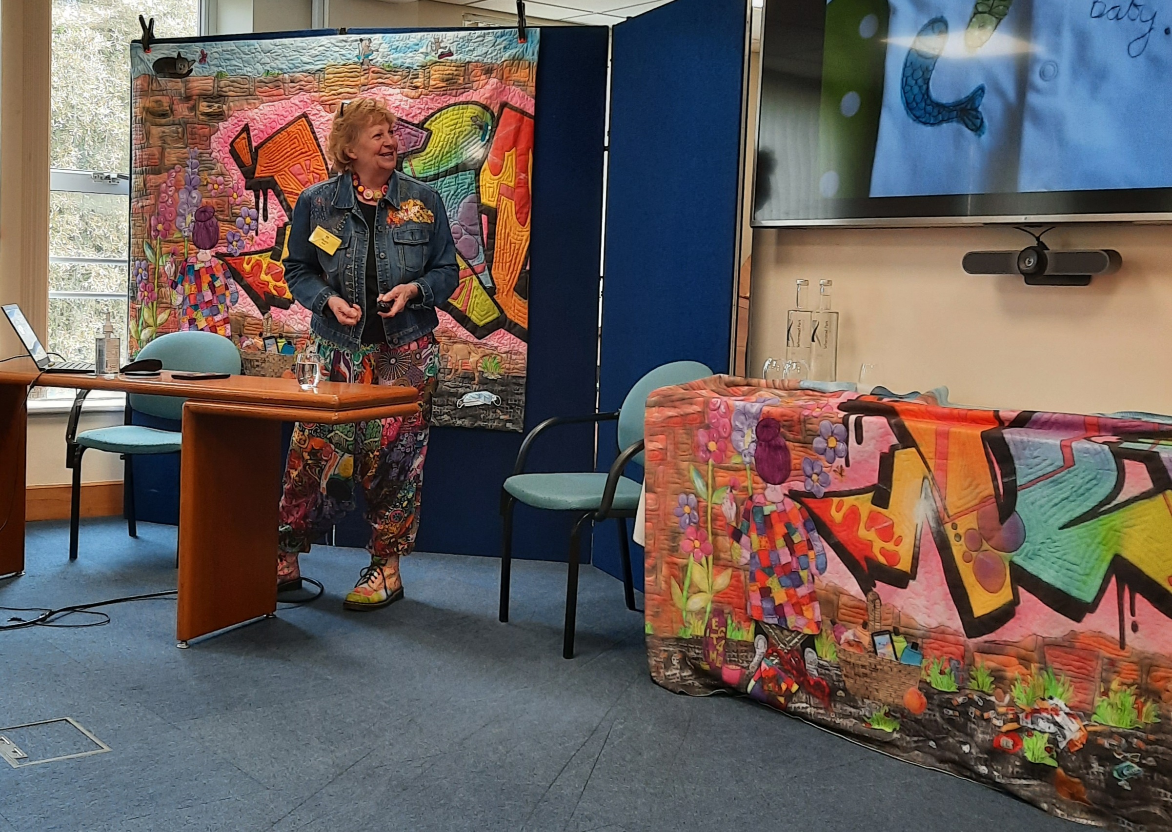 Moira Neal’s talk was about enjoying lockdown! She shared with the audience, the many creative activities she undertook during the three lockdowns and showed us the large graffiti quilt above (made together with graffiti artist Kilo and entered into the Festival of Quilts 2021 in the two-person quilt category). Also on display was the quilt below, made from several ‘disposable’ hotel table-cloths (now seen as black dresses), as a protest against using paper products just once and then throwing them away.