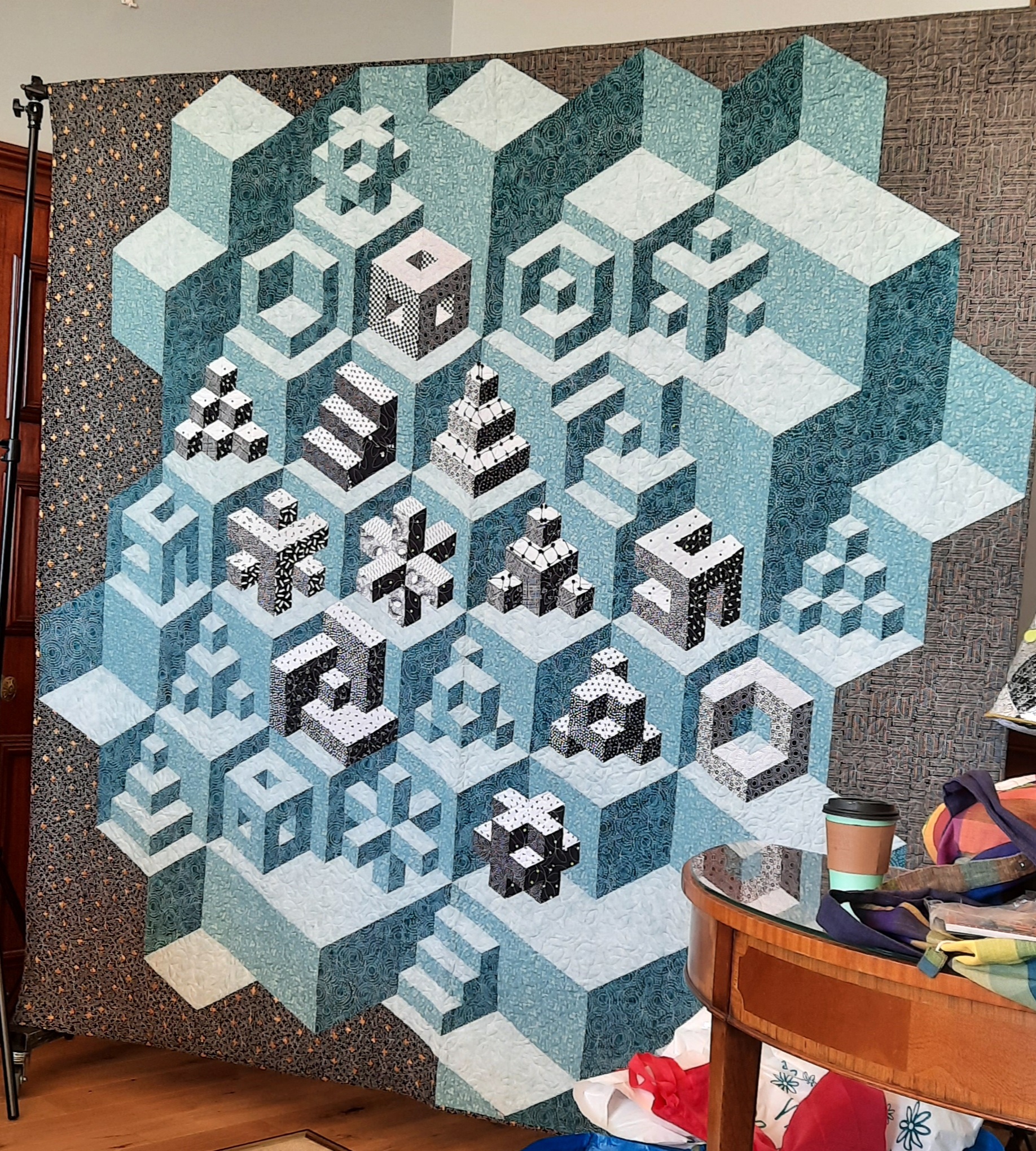 Helen Butcher (pictured above) also contributed to the debate about Modern Quilts, by showing some of her own, including the green piece above and the interesting illusion-creating quilt below. Helen has a Graphics background and revels in creating these complex shapes. Interestingly, she wondered aloud if this quilt IS a Modern quilt!
