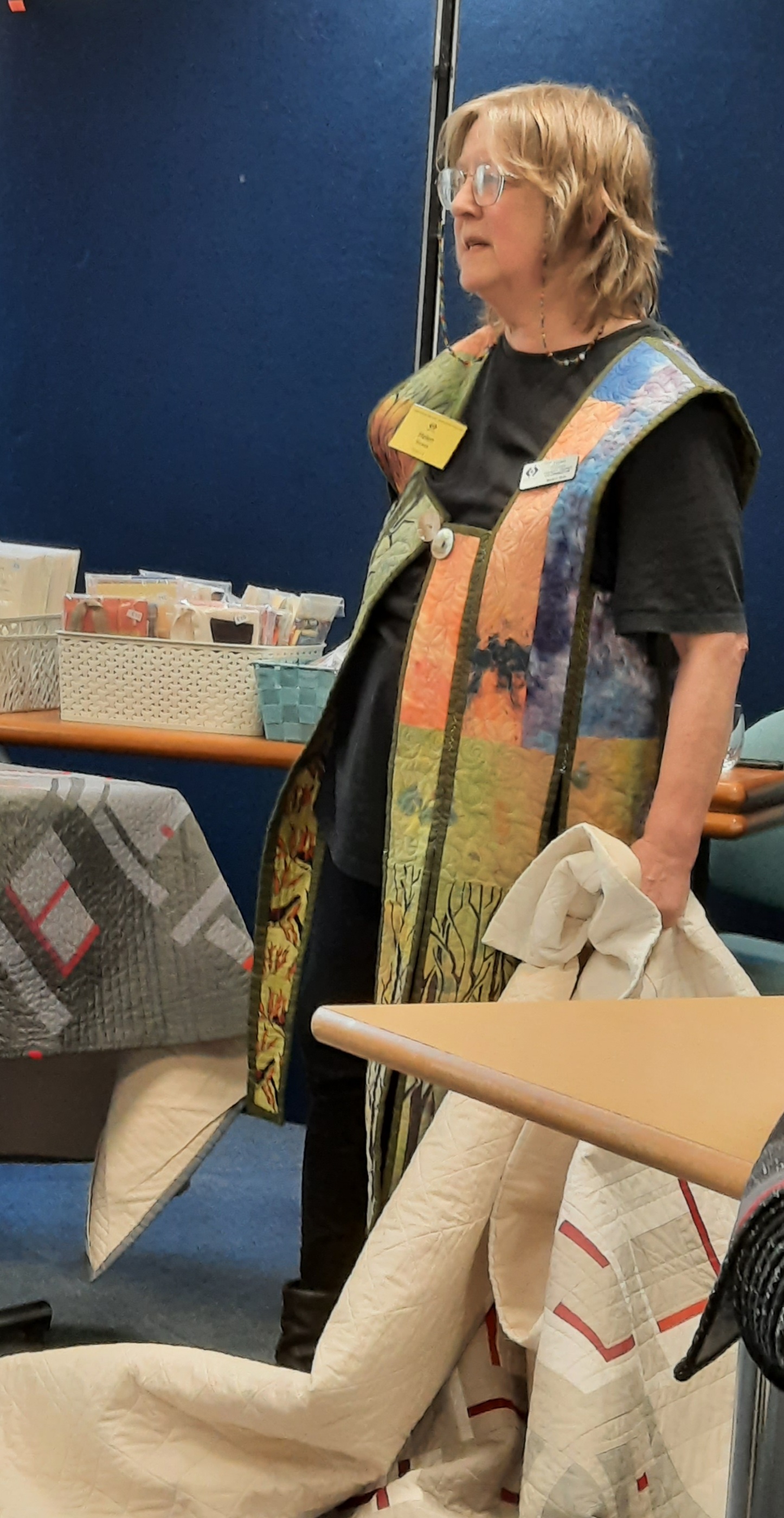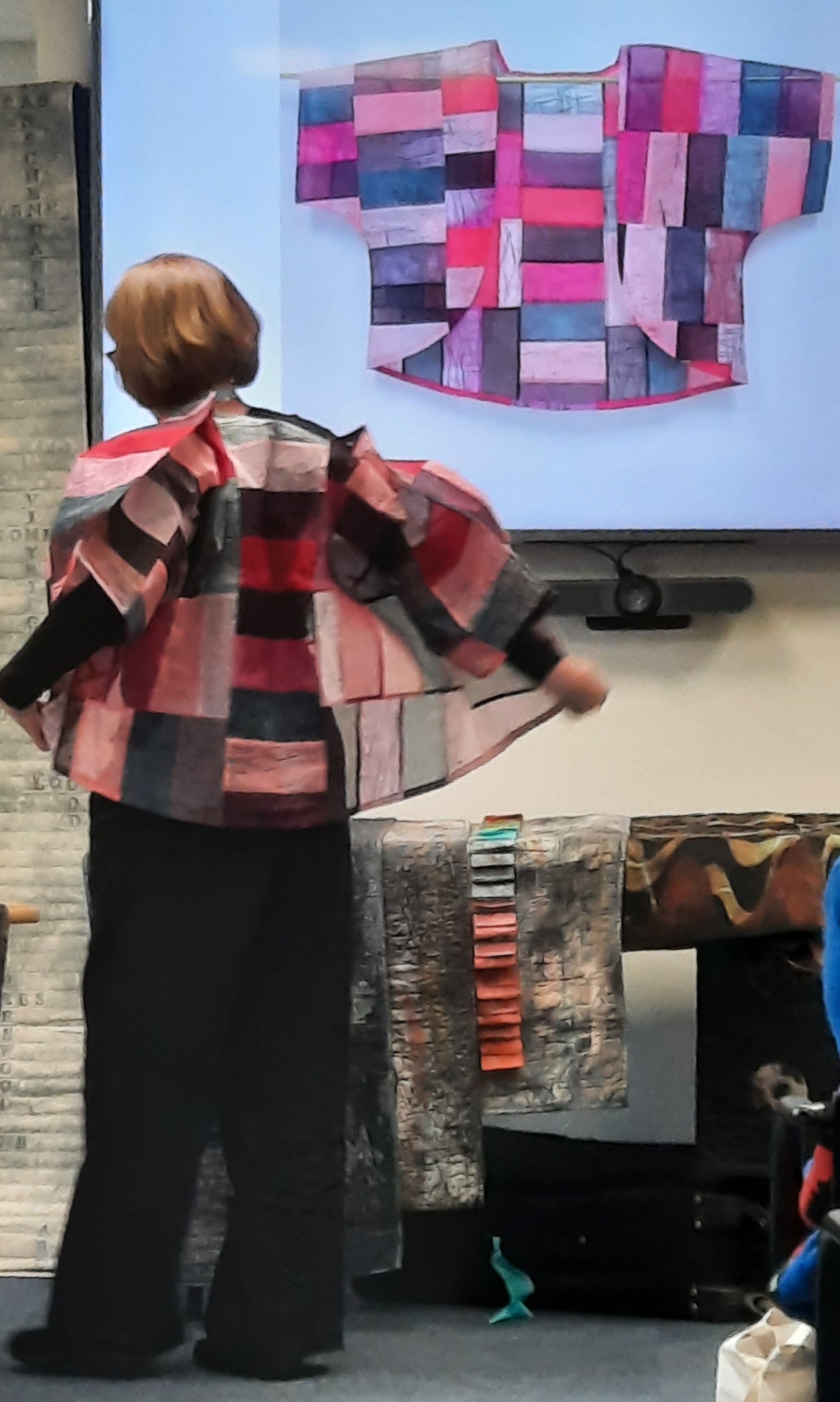 Mary’s talk expanded on the many ways in which she alters cloth for her quilts, including, for example, dyeing, using discharge paste, re-dyeing, printing, painting and manipulation. These effects can be seen in the quilts hanging behind her in the photo above. She is interested in texture and form – as seen in the dramatic semi-opaque jacket displayed on the screen and modelled by Mary herself.